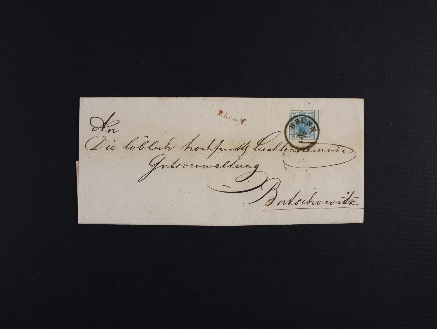 skl. R-dopis z r. 1852 frank. zn. Fe. č. 5 HP, typ IIc, pod. jednokruh. černé raz. BRÜNN 16.2., na zadní str. dofrank. RECO-poplatek dvoupáskou zn. Fe. č. 3 (při otevírání dopisu uprostřed vodorovně přetržena) + přích. řádkové raz. BUČOVICE