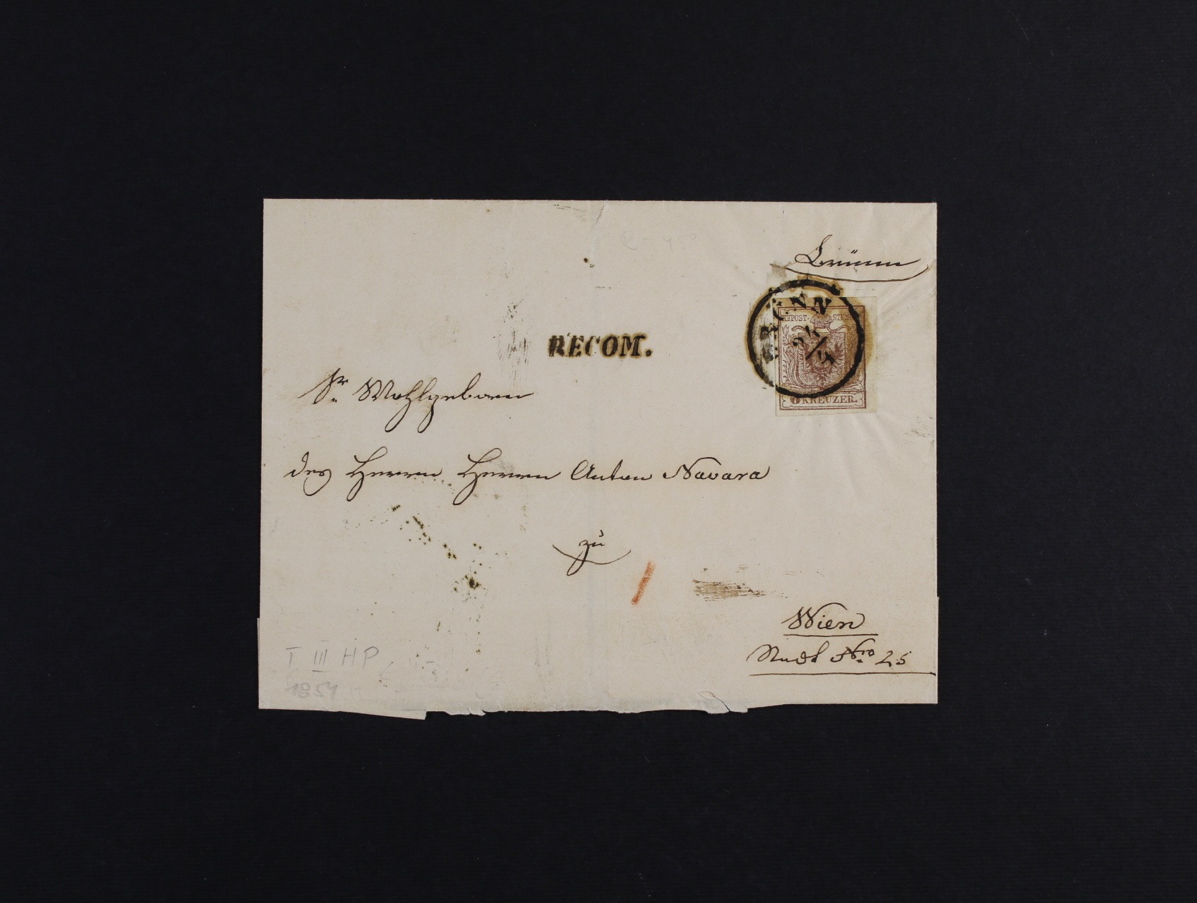skl. R-dopis do Vídně z r.1854 frank. zn. Fe. č. 4, typ III HP na přední i zadní straně, pod. jednokruh. raz. BRÜNN 24.4. + neporušená pečeť a přích. raz.
