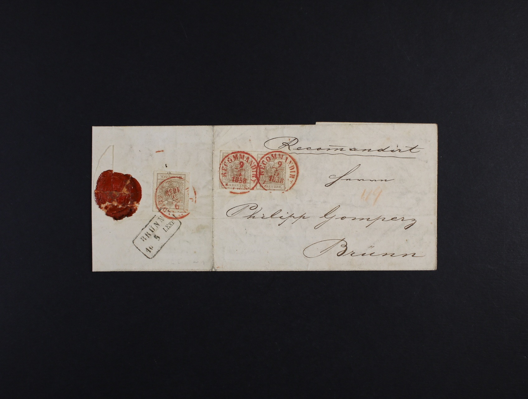 skládaný R-dopis z r. 1858 frank. zn. Fe. č. 4 3x6kr III. Typy MP, z Vídně do Brna, červená raz. , ex. Provera, adresováno na významného židovského podnikatele a zakladatele Židovské náboženské obce v Brně Philippa Gomperze, kat. min. 4000 EUR (jen jako 6+6 s červenými razítky)