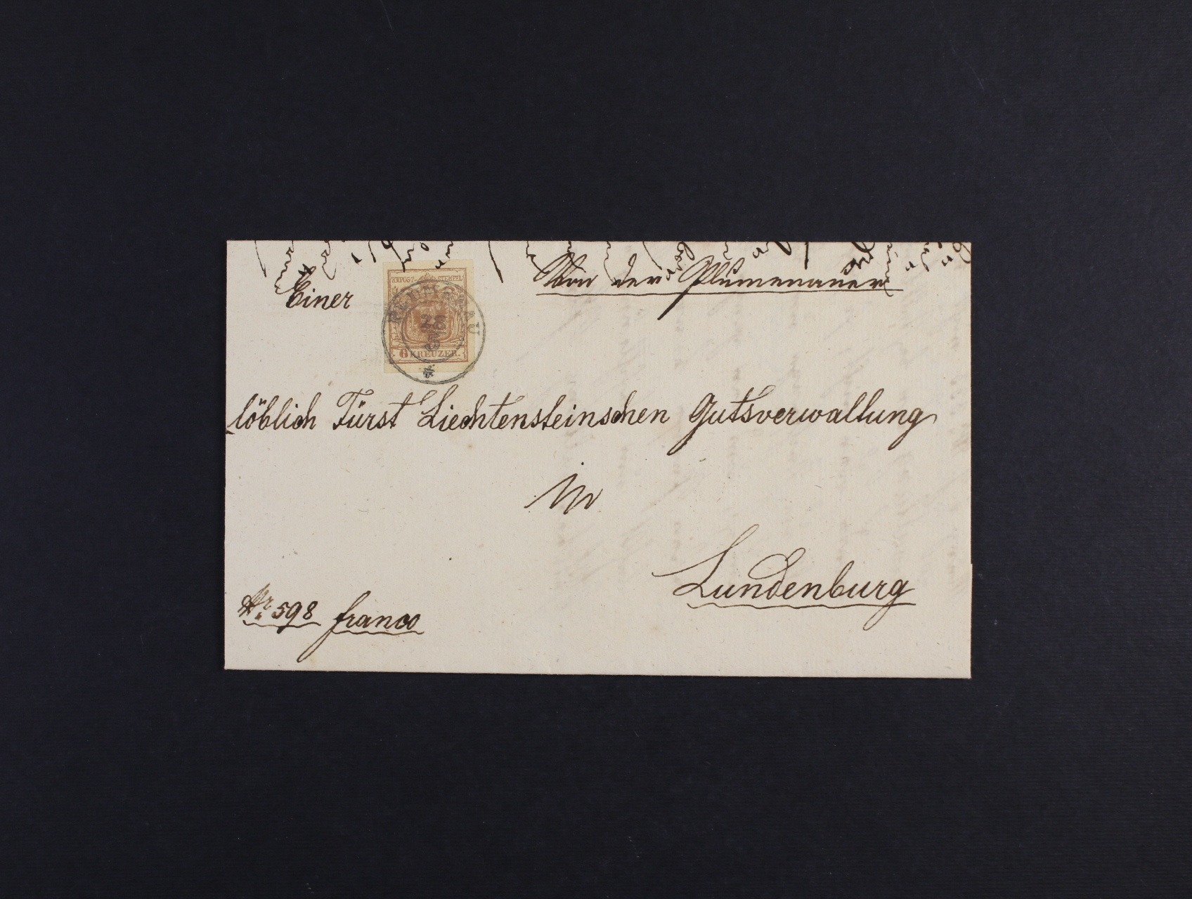 skl. dopis z r. 1852 do Břeclavi na Správu Liechtensteinských nemovitostí frank. zn. Fe. č. 4 HP, typ I, červenohnědá, pěkný střih, pod. dvoukruh. raz. PLUMENAU 28.5., průch. raz. PROSTĚJOV, příchozí raz. LUNDENBURG 29.5., tzv. "Kabinetstück"