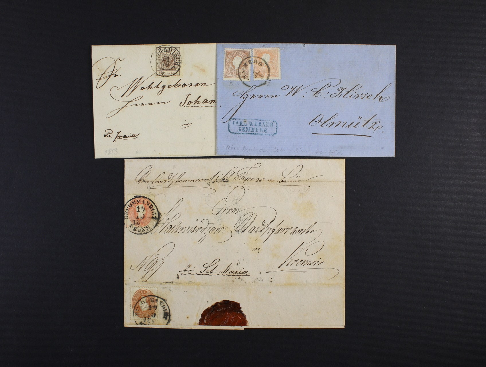 skl. dopis do Vranova z r. 1853 frank. zn. Fe. č. 4, typ III HP, pod. raz. U. HRADISCH 31.10. s ruční poznámkou Franco, průch. a přích. raz., skl. dopis do Olomouce z r. 1861 frank. zn. Fe. č. 13 II + 14 II, pod. raz. LEMBERG 5.1. a skl. dopis do Kroměříže z r. 1862 frank. zn. Fe. č. 21 + 22, pod. raz. RECOMMANDIRT BRÜNN 19.10.1962