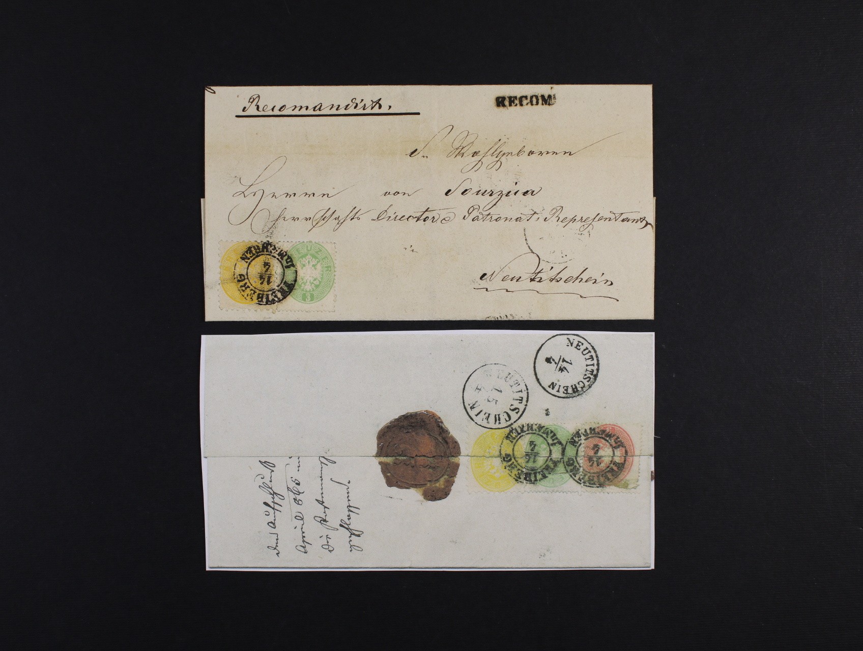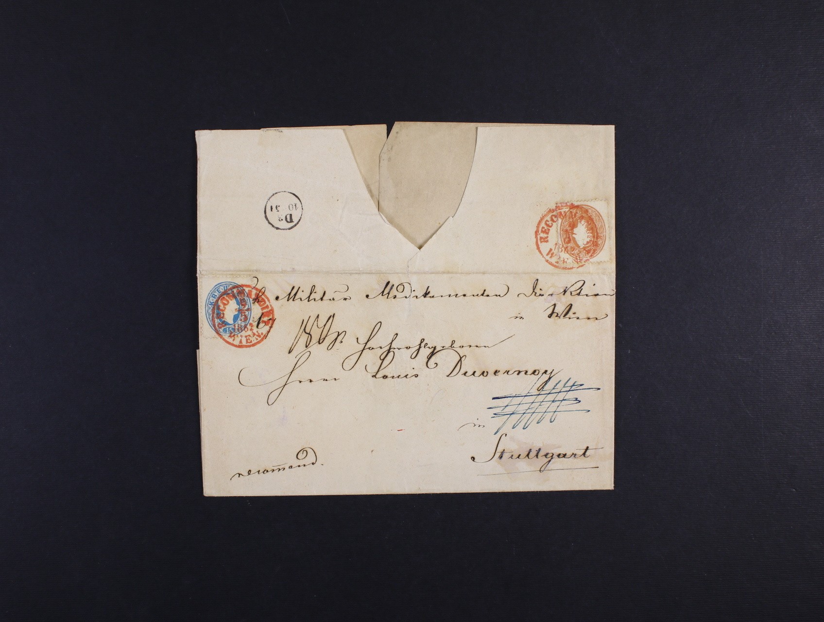skl. R-dopis z r.1862 do Německa frank. na přední str. zn. Fe. č. 21, na zadní str. zn. Fe. č. 22 (10kr. + 15kr), pod. červené jednokruh. raz. RECOMMANDIRT WIEN 9.5.1862, na zadní str. průch. dvoukruh. raz. K.WIEN.T.FAHREND.POSTAMT.10.5., velmi zajímavé, kat. Fe. 350 EUR