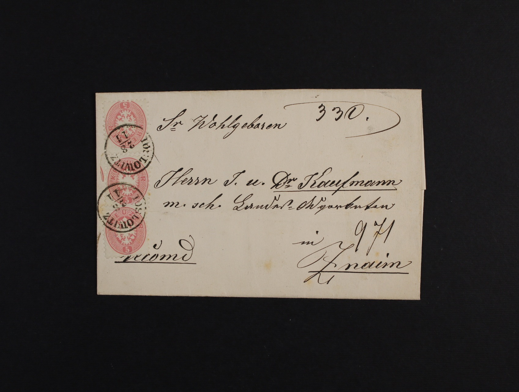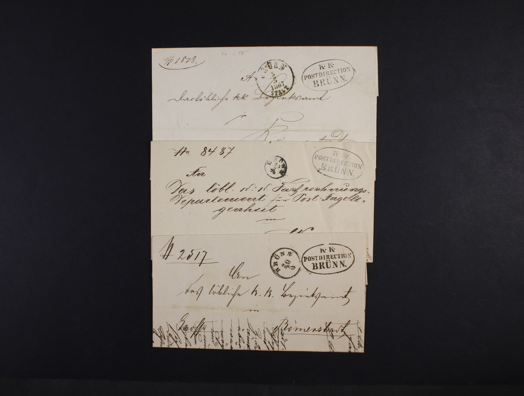 sestava 3 ks služebních dopisů z let 1862 - 1870 s pod. jednokruh. raz. BRÜNN 20.5. + úřední oválné raz. K.K. POSTDIRECTION, skl. dopis do Vídně s pod. náprstkovým raz. BRÜNN 23.8.70 + oválné raz. K.K.POST..., skl. dopis s pod. jednokruh. raz. BRÜNN 5.3.1867 + služební oválné raz. K.K.POST..., na zadní str. úřední zálepka K.K. POST-DIRECTION FÜR Mähren u. Schlesien Brünn, při otevírání přetržena