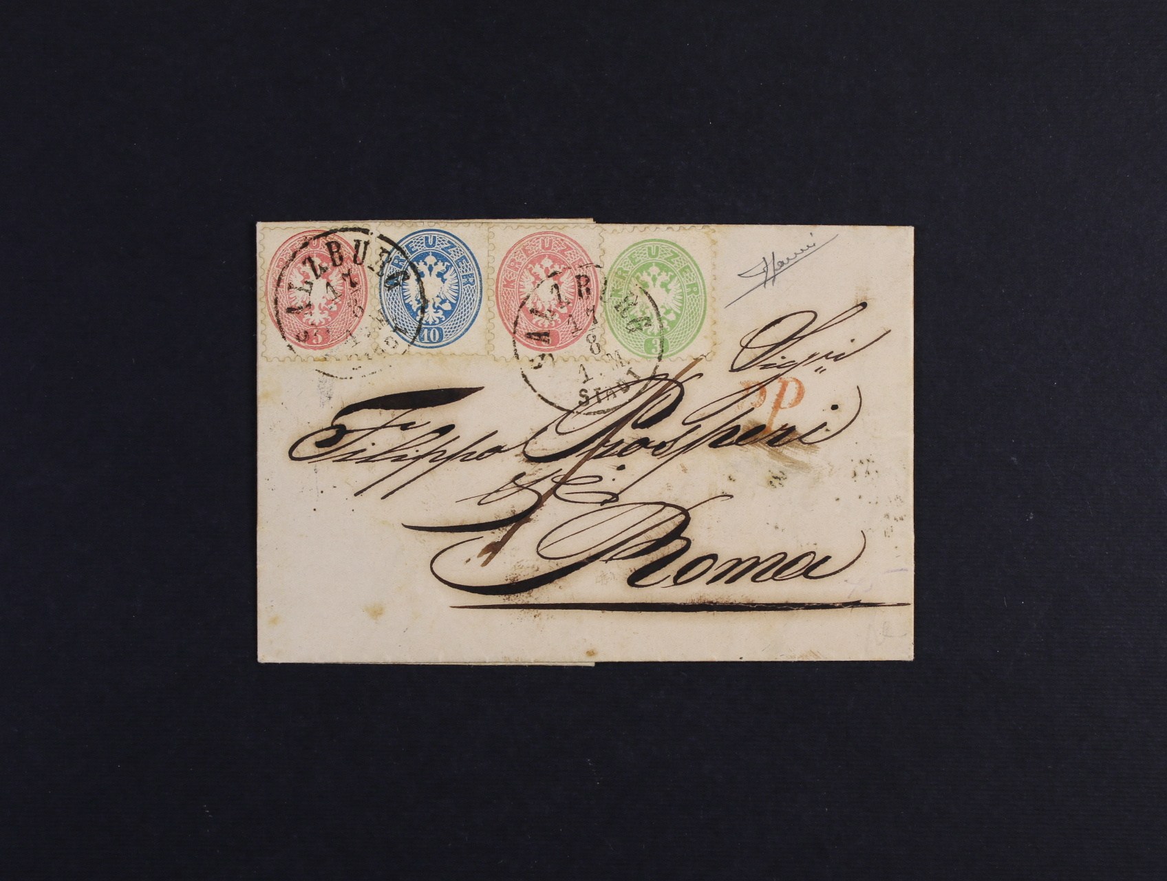 skl. dopis z r. 1867 do Říma frank. násobnou tříbar. frankaturou zn. Fe. č. 31, 32 (2x), 33 s jednokruh. pod. raz. SALZBURG 17.8. + průch. a přích. raz., atest Sorani