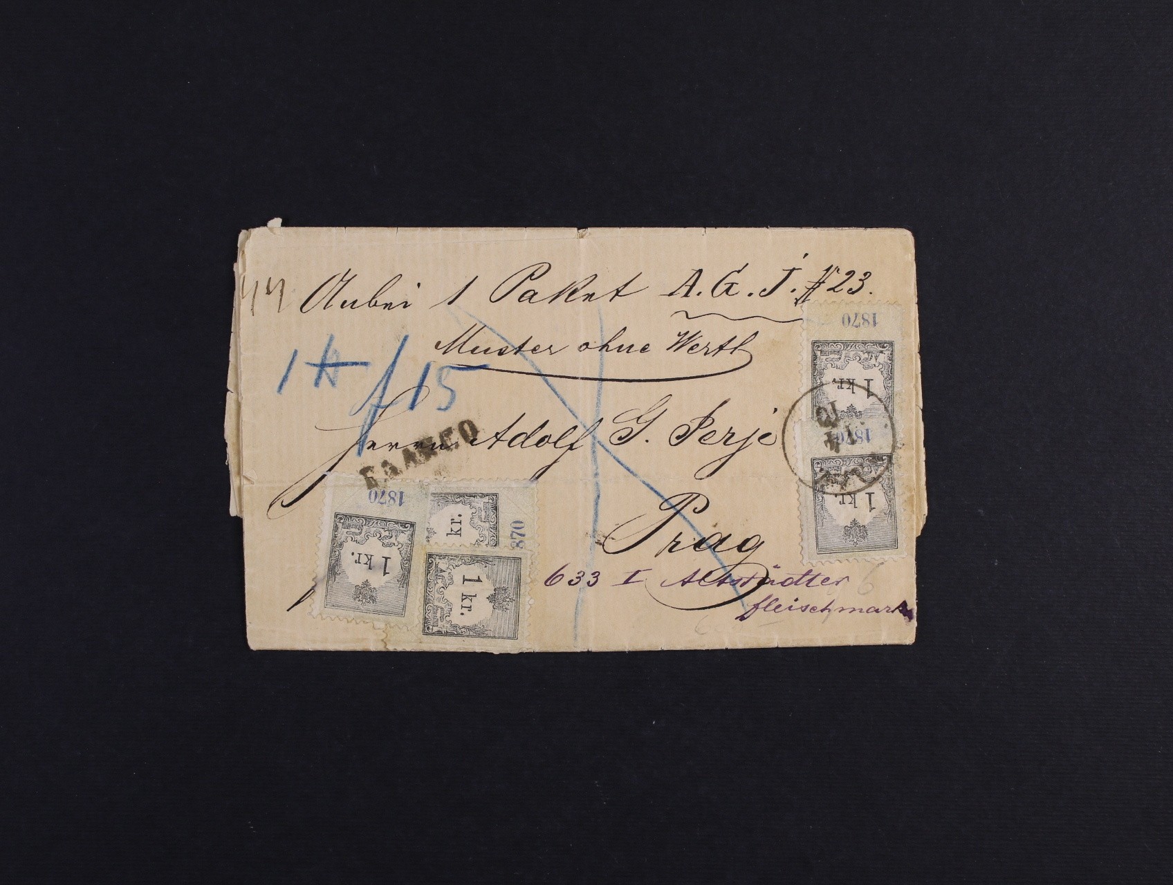 skl. vlakový průvodní dopis do Prahy s ručně psanou poznámkou Muster ohne Werth, frank. kolkem 1Kr emise 1870 (5x), pod. raz. SAAZ 14.10. + přídavné řádk. raz. FRANCO, na zadní str. modrá průvodní nálepka Von Saaz 43, velmi zajímavé