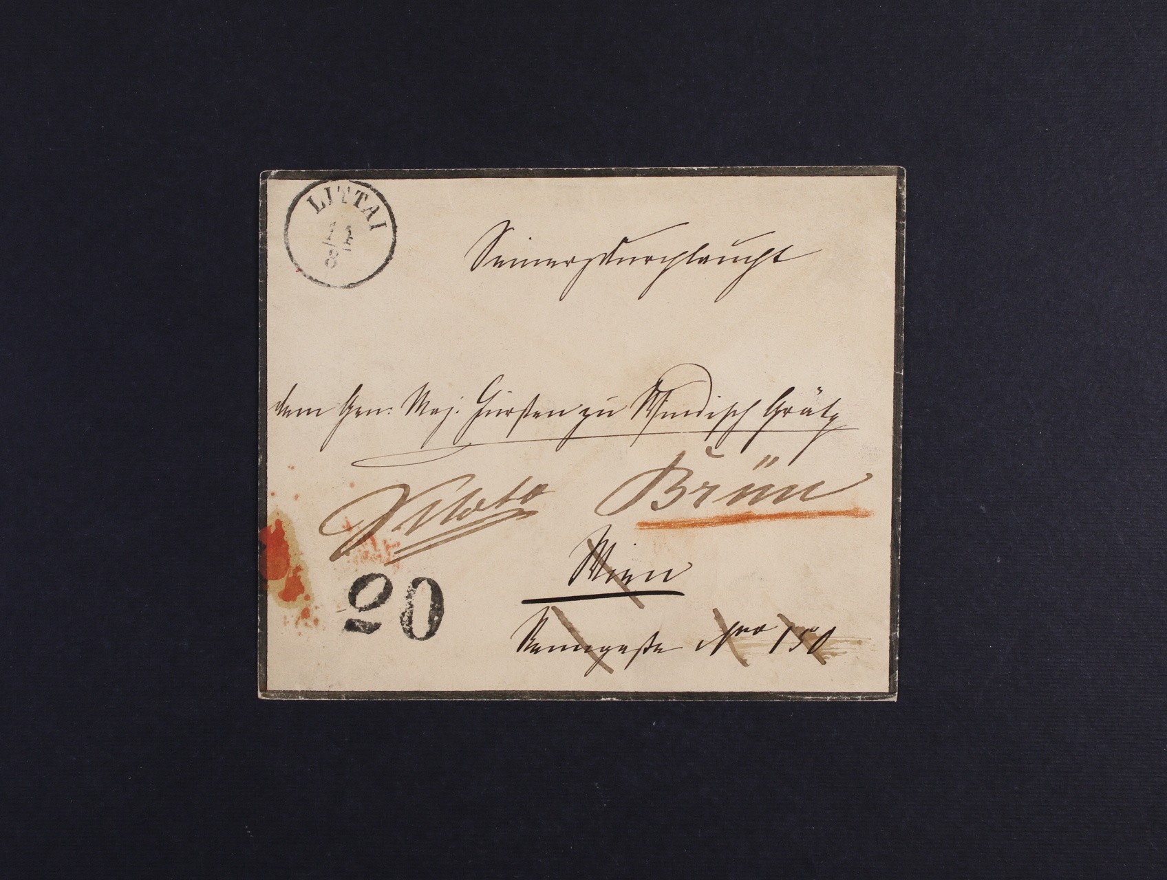 služební dopis z Littai (Litia - Slovinsko) 11.3. do Vídně a následně dosílaný do Brna s vybraným poplatkem, na zadní str. červené jednokruhové přích. raz. WIEN 15.8. a černé rámneč. raz. BRÜNN 16.AUG.