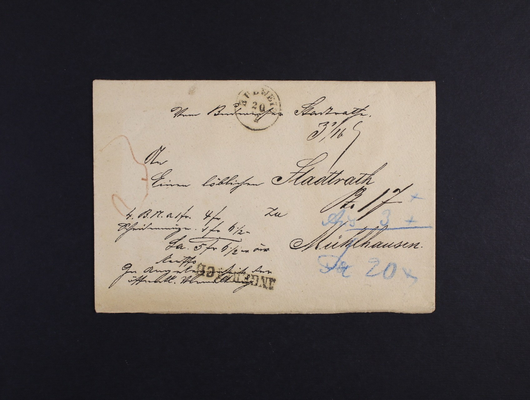 cenné psaní z Budějovic do Mühlhausen, pod. raz. BUDWEIS 20.2. + přídavné řádk. raz. ANGEREICHT, na zadní str. 5x neporušená pečeť městského úřadu Budějovice