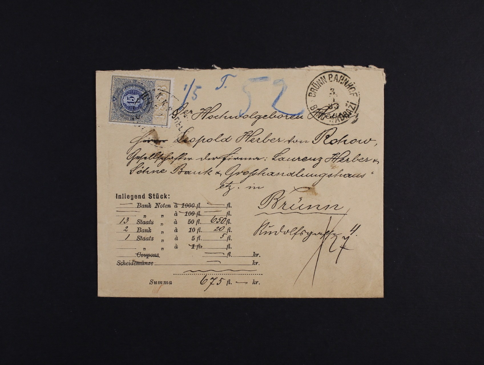cenné psaní 675fl. v místě s pod. raz. BRÜNN BAHNHOF 3.1.83, na zadfní str. s poznámkou Wird nicht angenomen 4.1.1883, na přední str. dolepen kolek 15kr. s úředním raz. K.K. ... s poznámkou 1/5, zajímavé