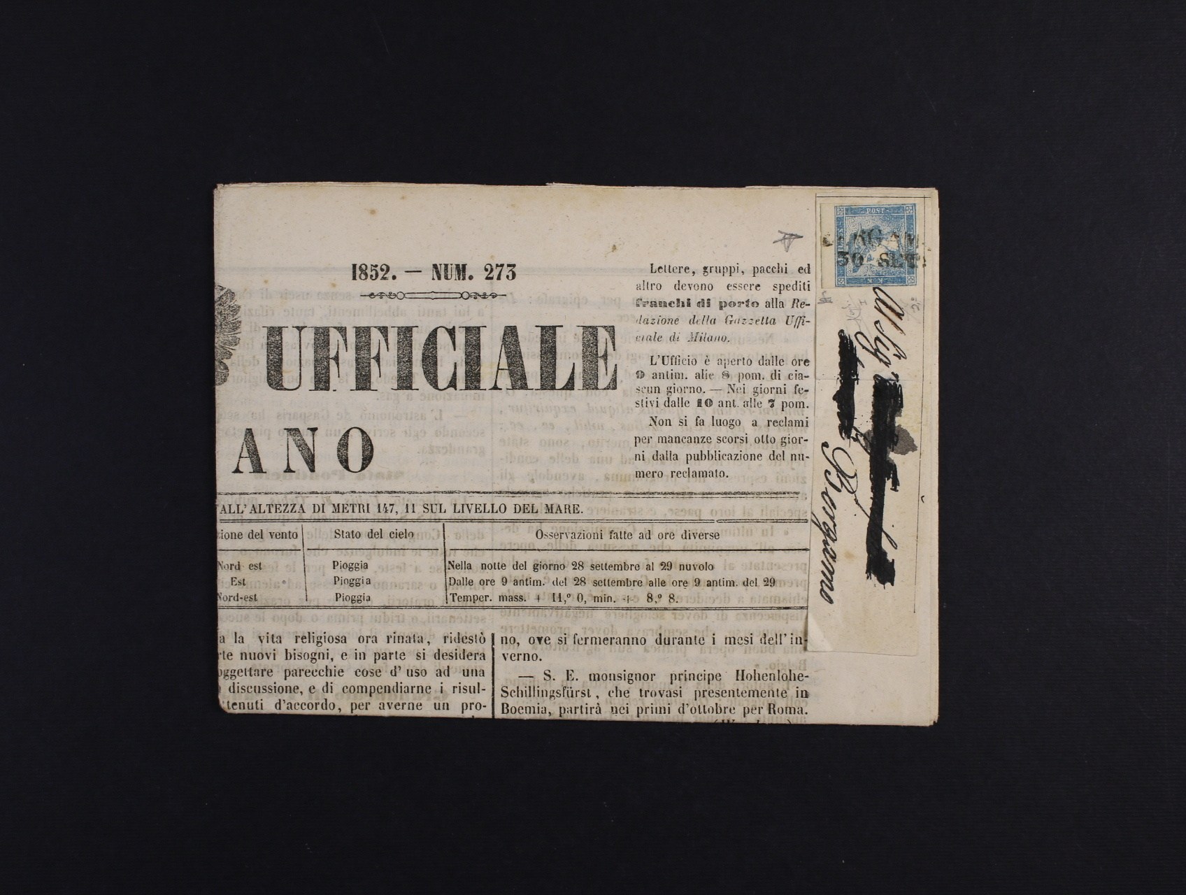 kompl. noviny GAZZETTA UFFICIALE DI MILANO 29.Sep.1952 frank. zn. Fe. č. 6 Modrý Merkur, typ I, s širokým horním okrajem, znehodnoc. řádk. raz. BERGAMO, atest Luigi Borreli