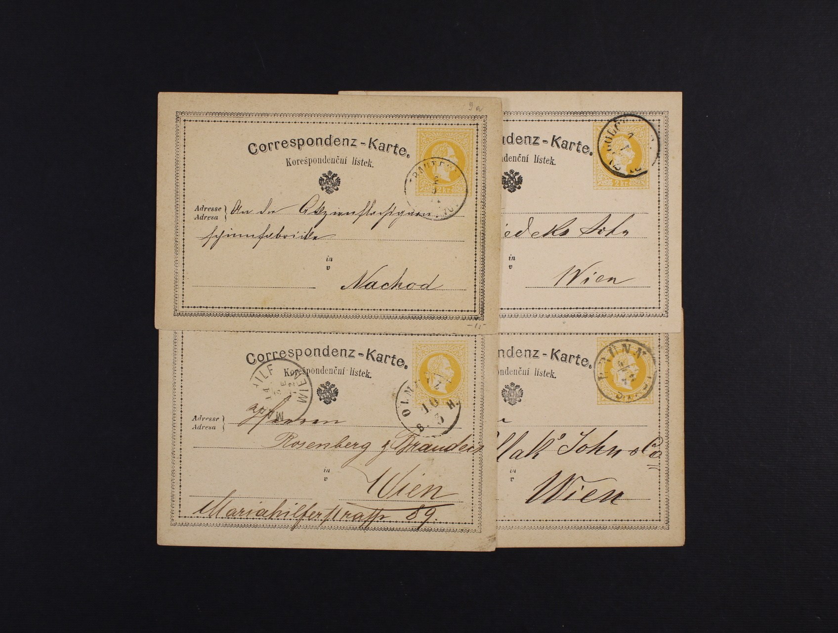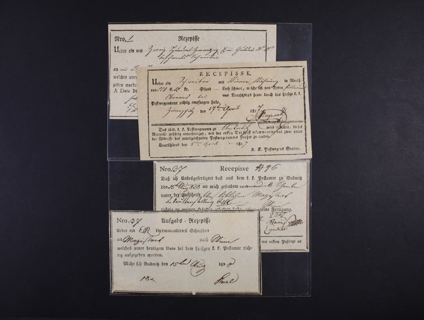 spárované poštmistrovské podací a zpáteční recepisy z r. 1817 Německý Brod a dtto z r. 1828 Moravské Budějovice, zajímavé