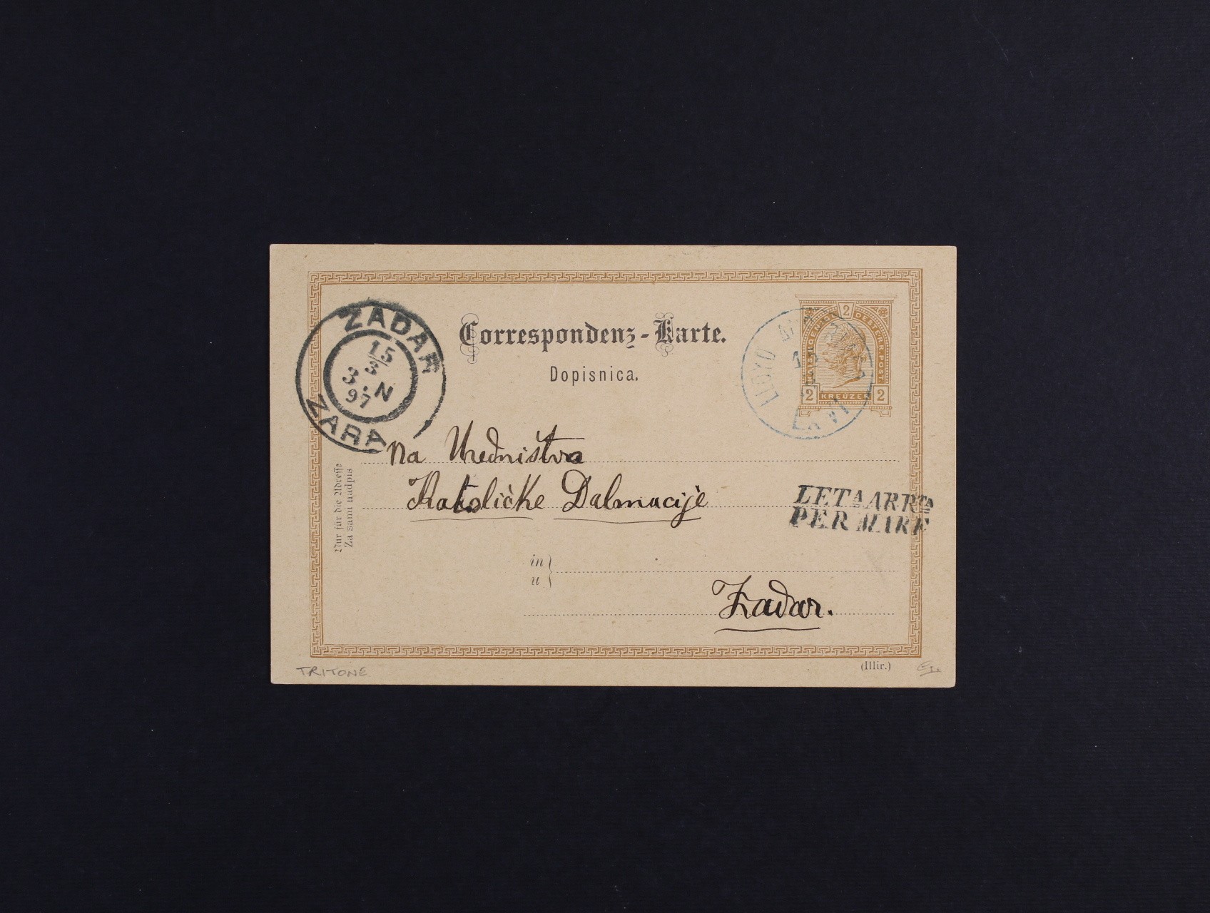 KL 2kr F.J. vlevo zaslaný lodní poštou do Zadaru, pod. modré jednokruh. raz. LLOYD AUSTRIACO 15.3.1897 + příd. řádkové raz. LETAARRTA PER MARE + přích. raz. ZADAR 15.3., dobrá kvalita