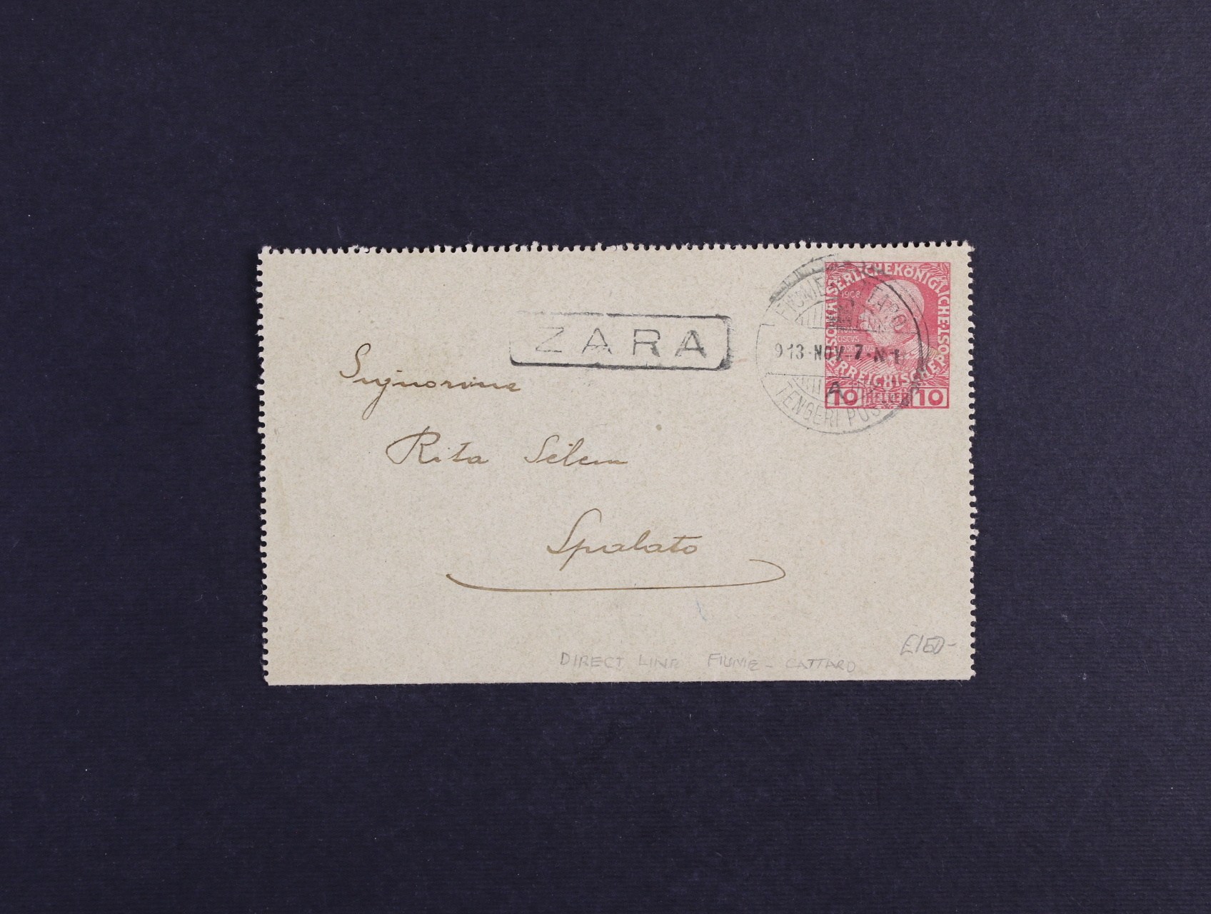 zálepka 10h F.J. I. přepr. lodní poštou s pod. raz. ENGERI POSTA FIUME CATARO 7.NOV.1913 + rámeč. raz. ZARA