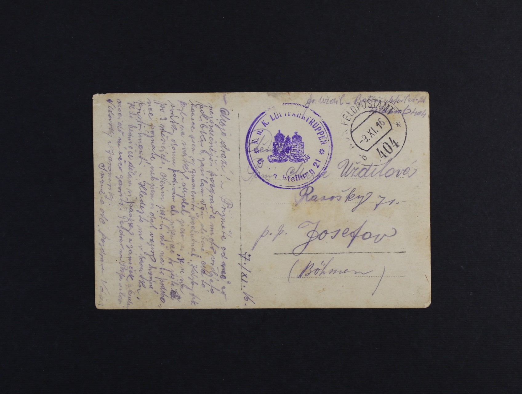 celistvost s pod. raz. K.u.K. M.F.P.A č. 404 9.11.16 + přídavné útvar. raz. K.u.K. LUFTFAHRTRUPPEN ABTEILUNG 21