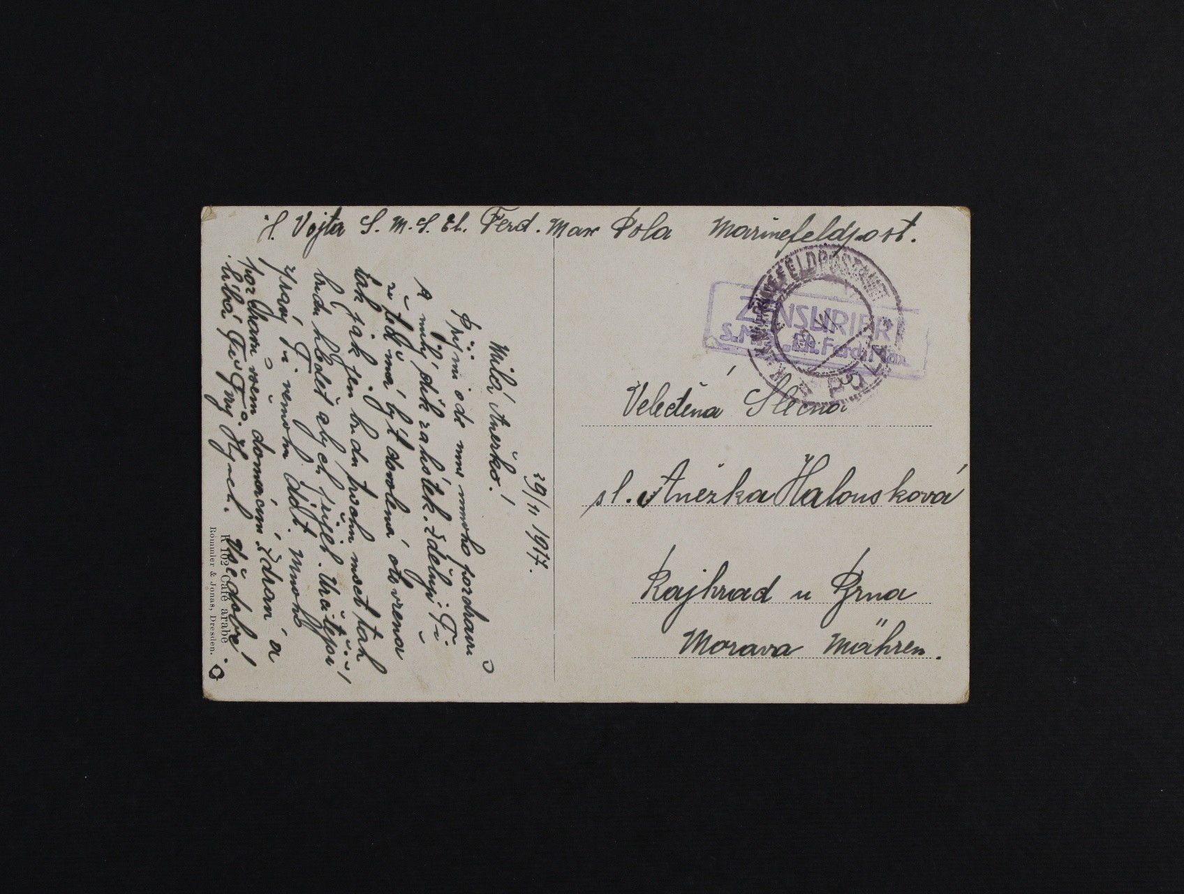 celistvost na Moravu s pod. raz. K.u.K. M.F.P.A. POLA 30.11.17 + rámeč. fialové raz. ZENSURIERT S.M.S. EH. FERDINAND, dobrá kvalita