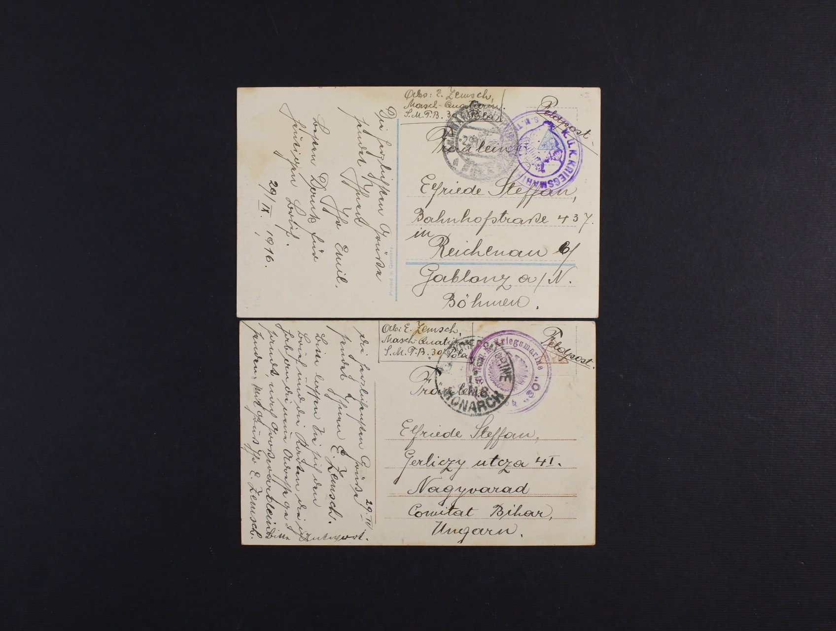 dvě celistvosti na Moravu s pod. raz. K.u.K. M.F.P.A. POLA 1915, resp. 1916 + přídavné černé jednokruh. raz. S.M.S. HERZOG FERDINAND MAX, resp. dtto ve fialové barvě, dobrá kvalita, zajímavé