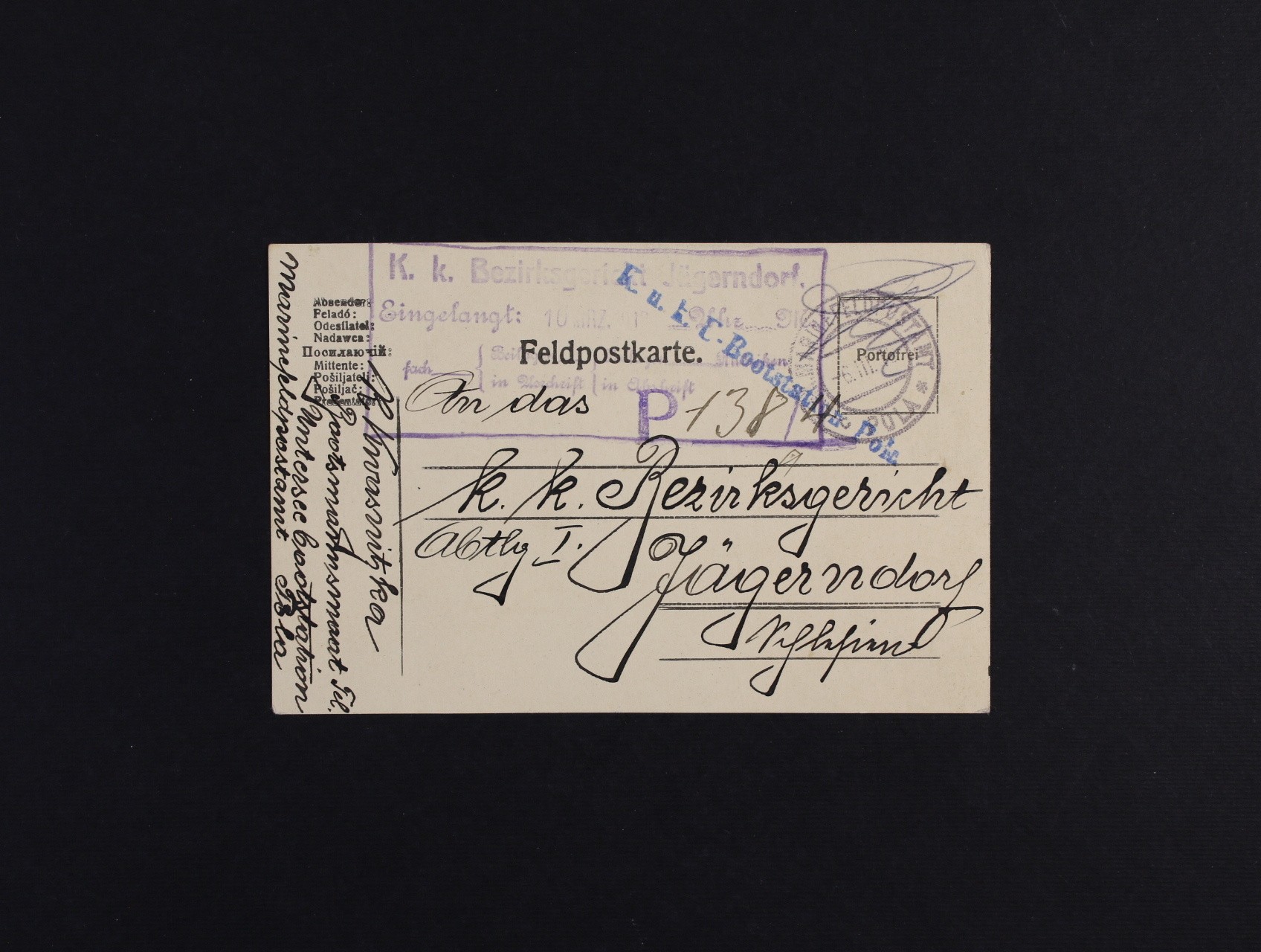 celistvost s pod. raz. K.u.K. MFPA POLA 6.3.18 + přídavné modré útvarové řádkové raz. K.u.k. U-Bootstation Pola + přích. prezenční raz., zajímavé, vzácné