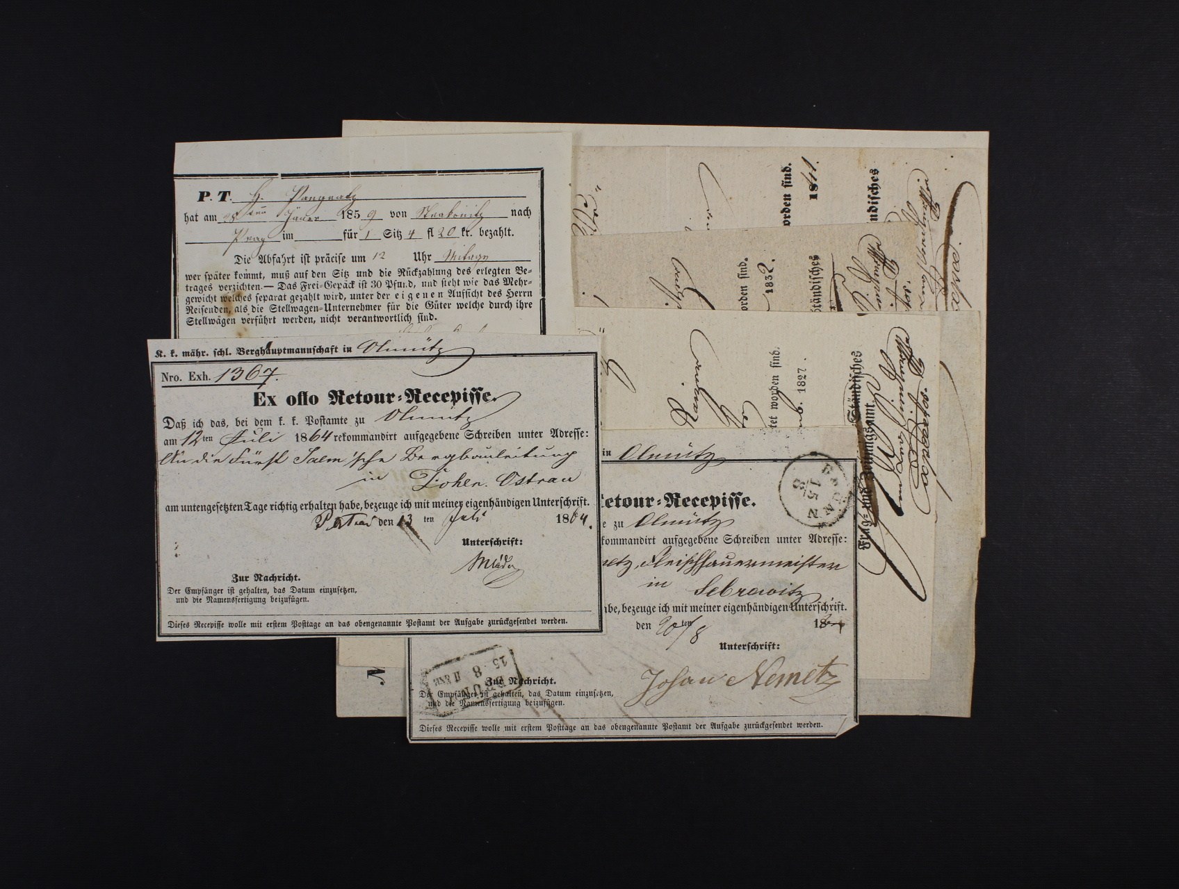 sestava 7 ks různých recepisů z let 1827 - 1864 + jízdenka na dostavník z r. 1859 ze Strakonic ...