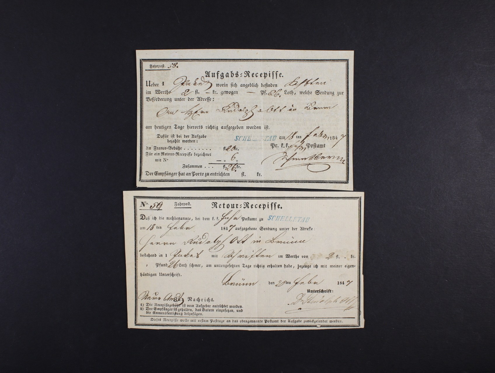 spárované podací a přích. recepisy z r. 1847 s modrým pod. řádk. raz. SCHELLETAU