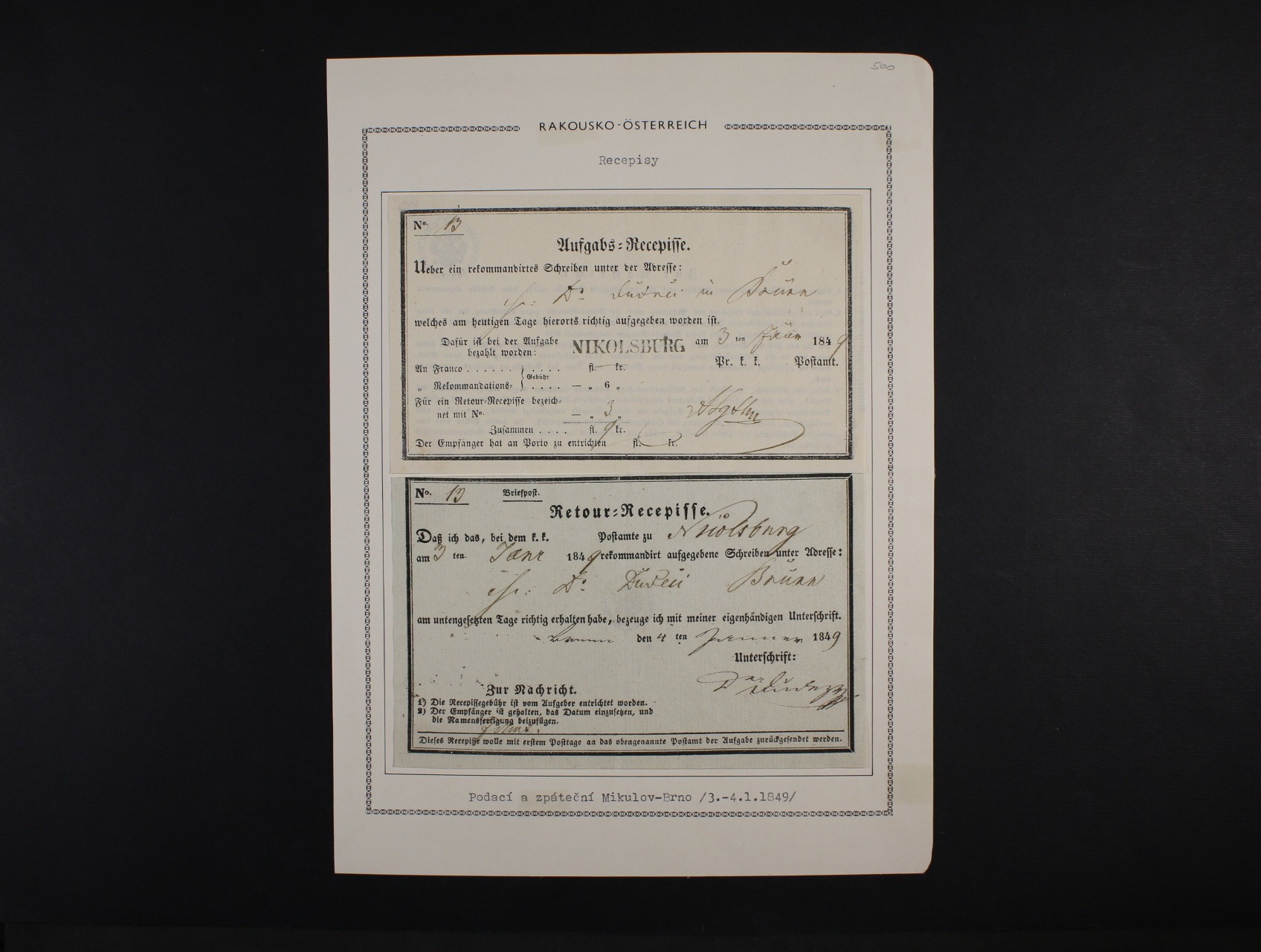 spárovaný podací a zpáteční recepis Mikulov - Brno z r. 1849, dobrá kvalita