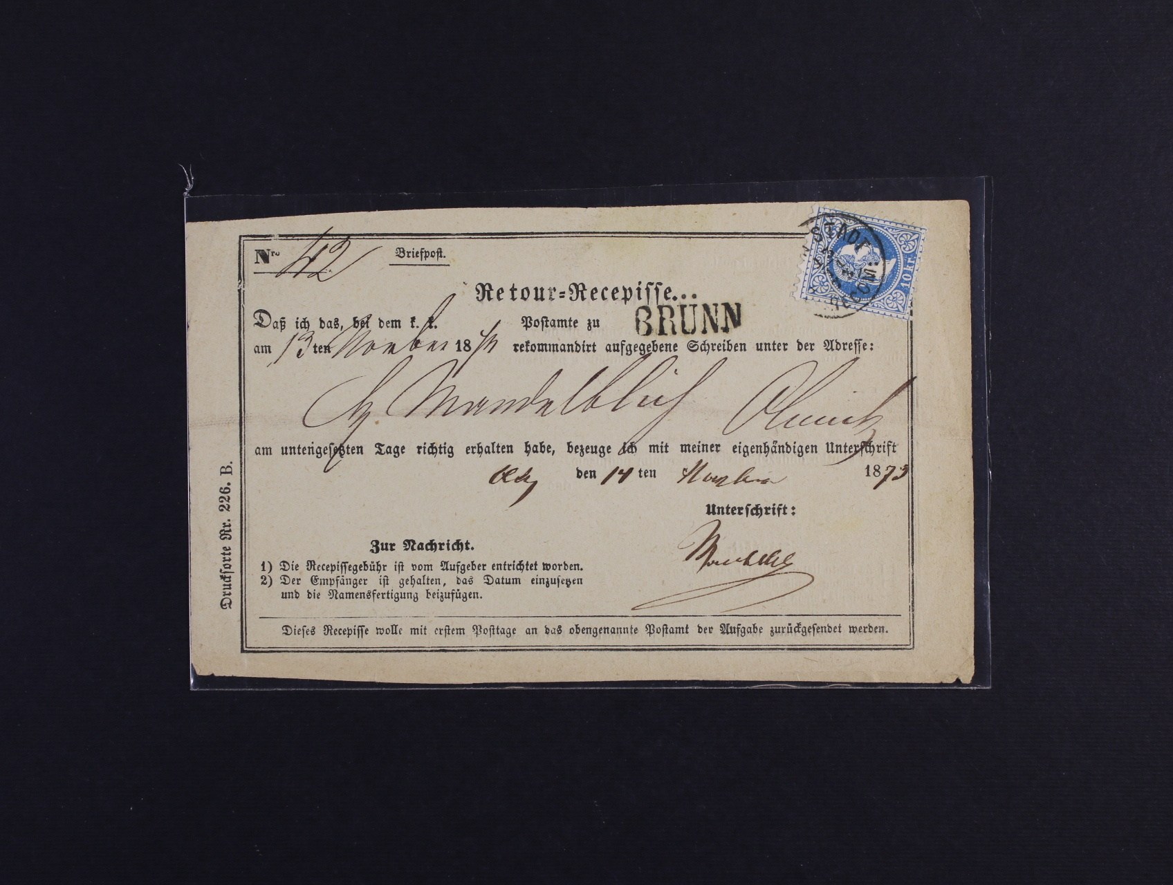 zpátečníí recepis frank. zn. Fe. č. 38 I, pod. jednokruh. raz. BRÜNN STADT RECOM 13.11.73 + přídavné řádk. černé raz. BRÜNN