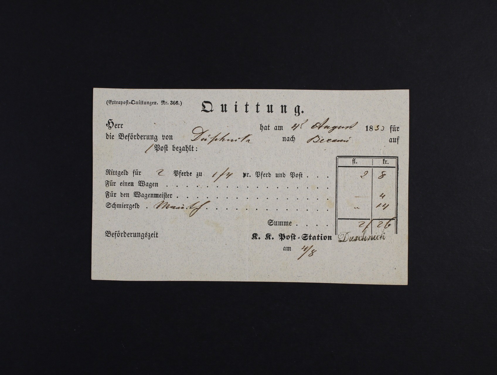 kvitance ze 4.8.1853 o zaplacení jízdného pro dvě osoby z Duschnik do Berouna v ceně 2zl 26kr s rozepsáním ceny na položky s řádk. raz. Duschnik v černé barvě