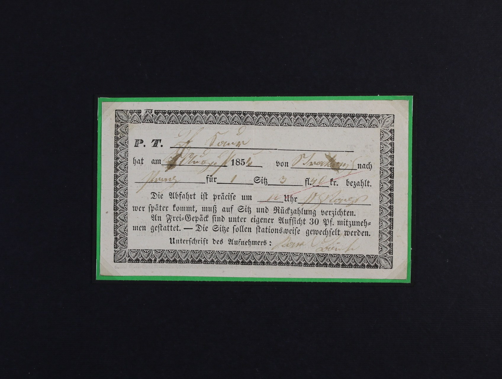 jízdenka na dostavník z 30.Aug.1854 ze Strakonic do Prahy s vyplaceným poplatkem 3fl 40kr, zajímavé