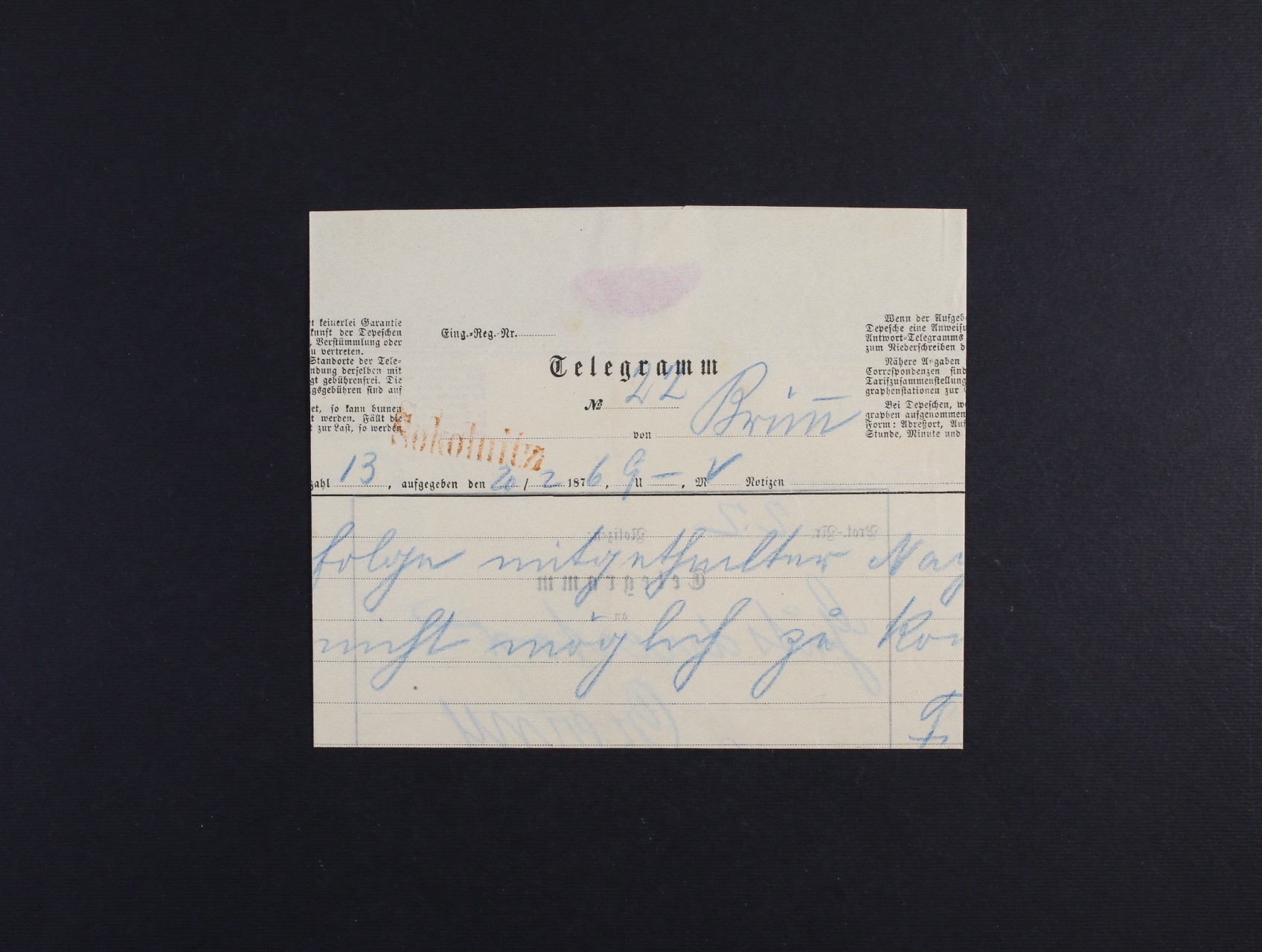 telegram do Brna s pod. řádkovým červeným raz. SOKOLNITZ s datací v textu 20.2.1876