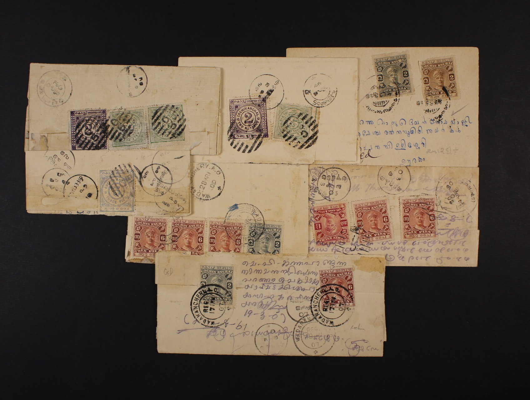 1421 Indie – COCHIN 1898-1916 - sestava 6 ks R-dopisů a 1 obyčejný, s barevnými frankaturami "číslicové vydání" 1898 a Rádža Varma I. 1911-1916, zajímavá razítka; vzácná destinace 3600