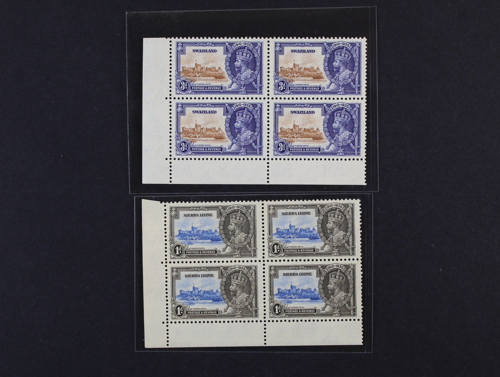 Swaziland 1935 - zn. SG. č. 21a, 23a, Jubilejní Jiří V. 1P, 3P - rohové 4-bloky s EXTRA FLAGSTAFF 1P se dvěma nálepkami, kat. 520 GBP