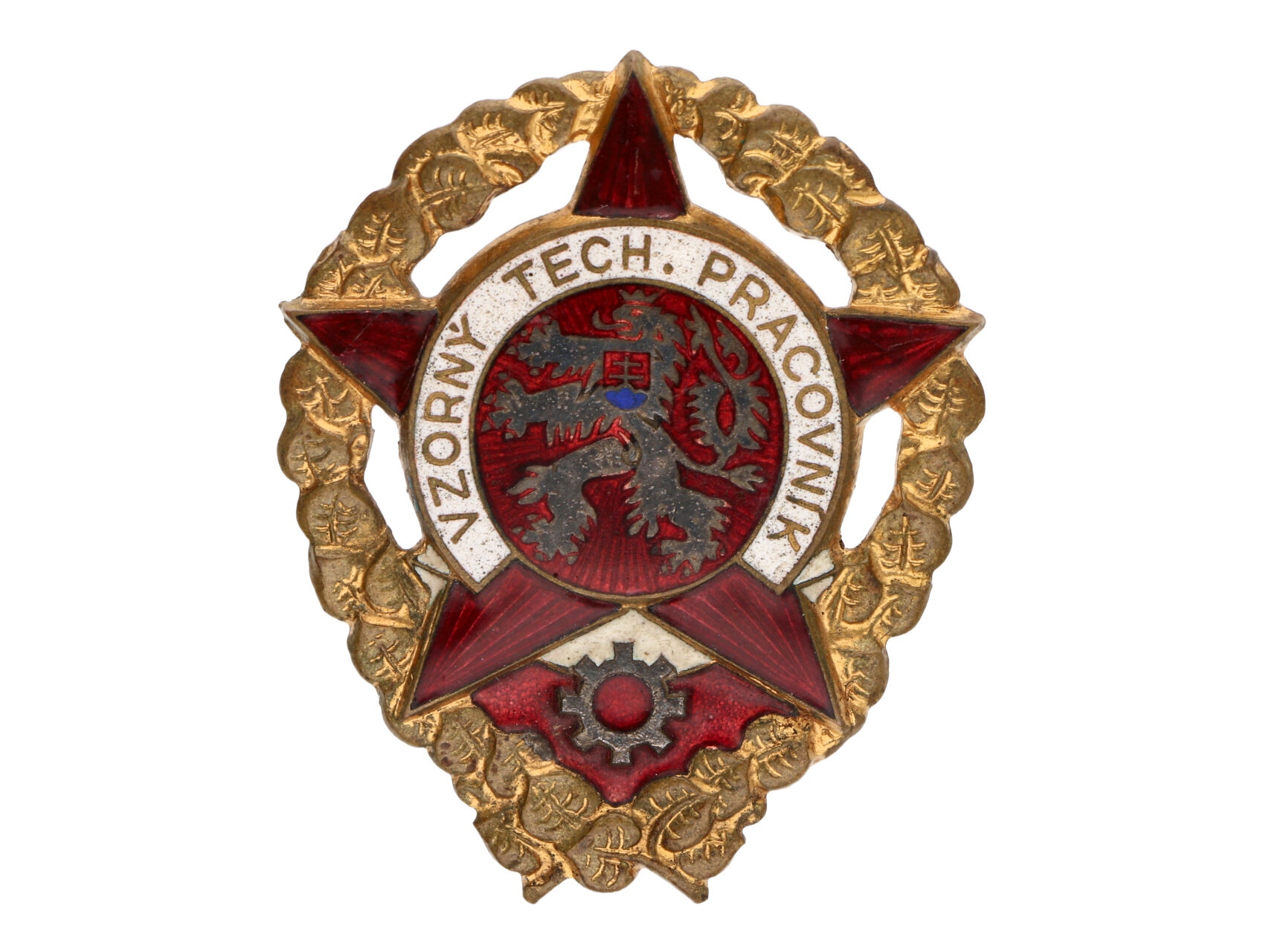 Odznak Vzorný technický pracovník č. 11135, pozlacený bronz, smalty