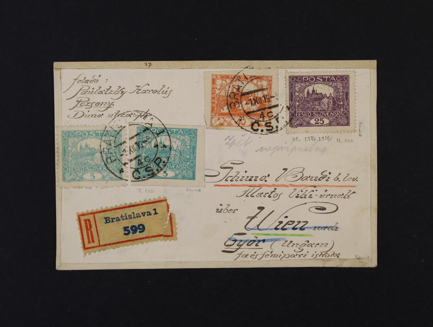 242 R-adresní lístek do Vídně frank. mj. zn. č. 11 A, typ II, 25h fialová (velmi vzácné) + zn. č. 4, typ I, pod. raz. BRATISLAVA 7.12.19, zk. Karásek 9000