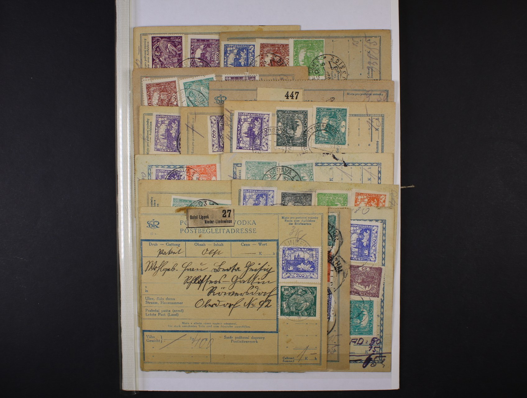246 sestava 30 ks dvoudílných pošt. průvodek frank. vysokou násobnou pestrou frankaturou, mj. zn. č. 21 - 26, 141, 161, zajímavé 5000
