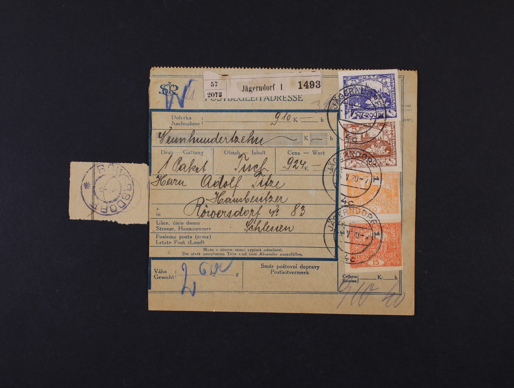 247 dvoudílná peněžní průvodka na 910K do Röwersdorfu ve Slezsku, frank. mj. zn. č. 22c tmavě modrá, pod. raz. JÄGERNDORF 13.5.20, zk. Štolfa 900