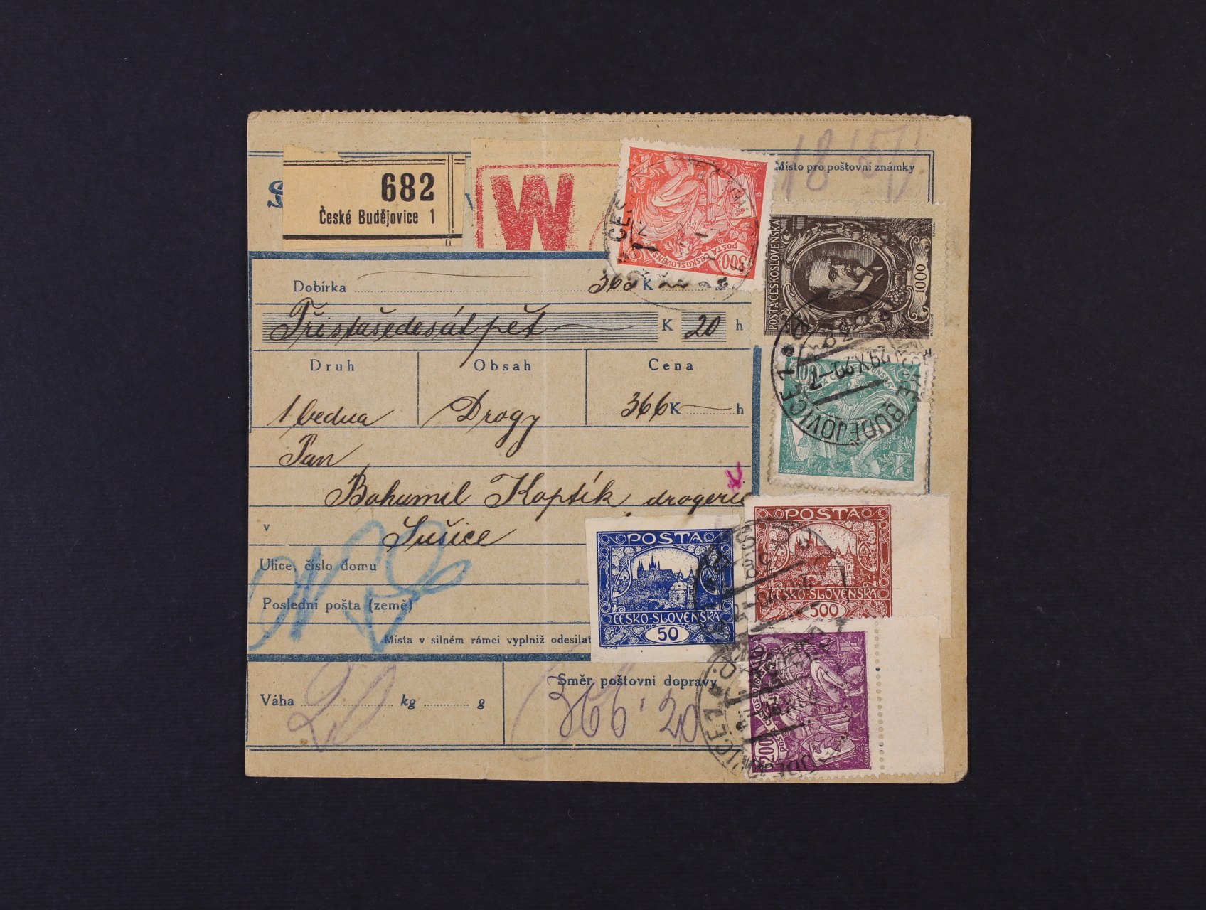 248 dvoudílná pošt. průvodka na 365,20K do Sušice frank. pestrou smíš. frankaturou tří emisí, mj. zn. č. 25, typ II, 142 1000h TGM, pod. raz. ČESKÉ BUDĚJOVICE 26.10.20, přích. raz. SUŠICE 30.10.20 1200