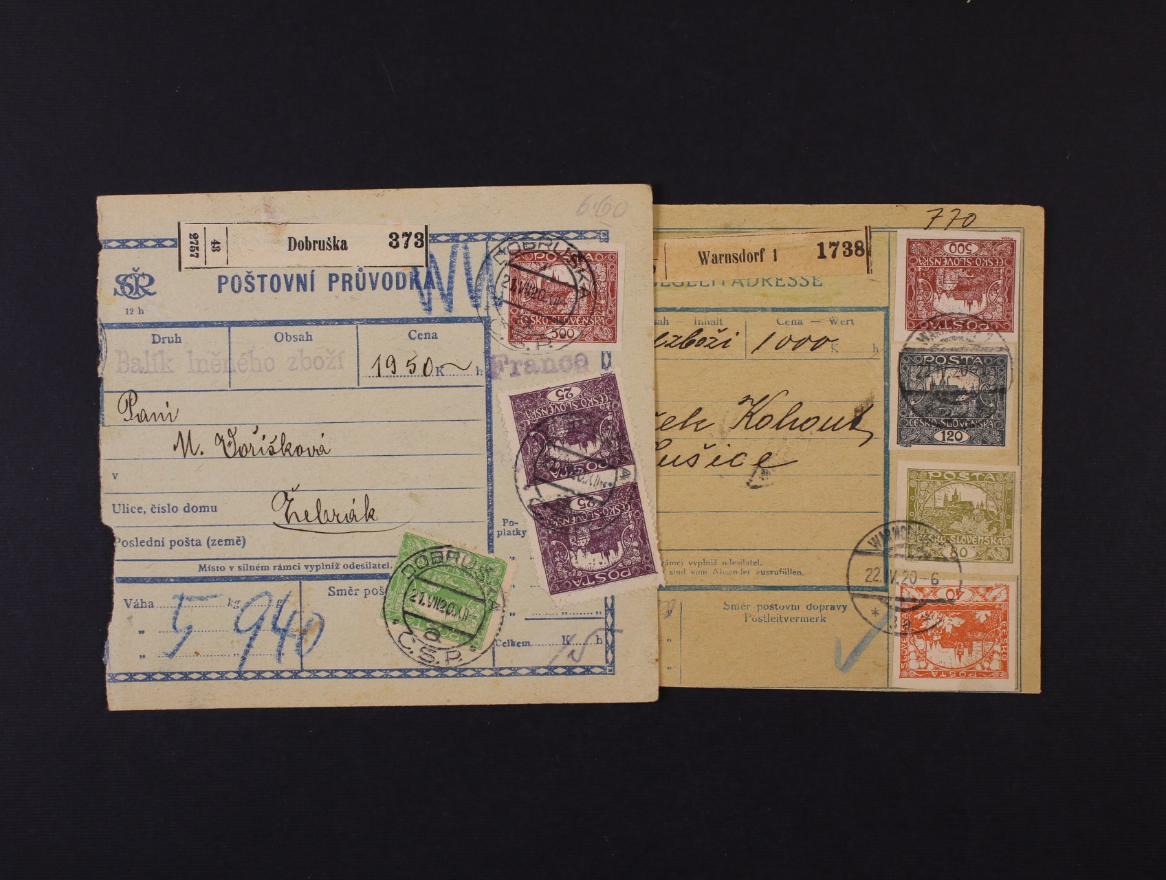 249 dvě dvoudílné pošt. průvodky frank. pestrou vysokou frankaturou, mj. zn. č. 25, DR OBRUŠKA 21.7.20, resp. WARNSDORF 22.5.20, zajímavé 400