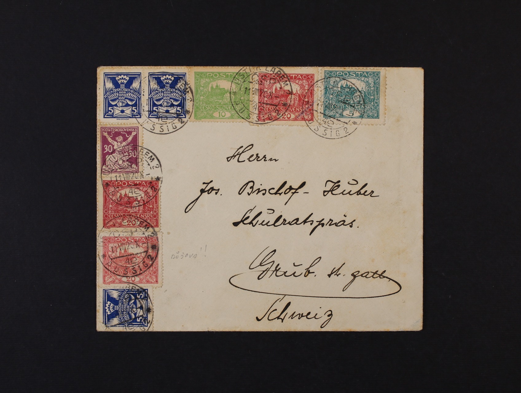 250 dopis do Švýcarska frank. pestrou smíš. frankaturou Hradčany + holubice + OR, pod. raz. ÚSTÍ N. LABEM 11.8.20 + přích. raz. GRUS 14.8.20, zajímavé 500
