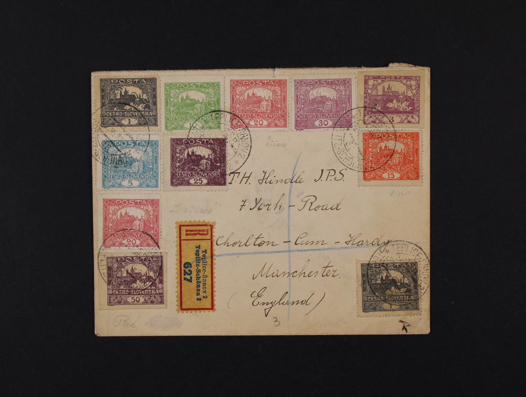 251 R-dopis do Anglie frank. pestrou zajímavou frankaturou, pod. raz. TEPLICE ŠANOV 2 22.6.20 + průch. raz. LONDON 27.6.20 600