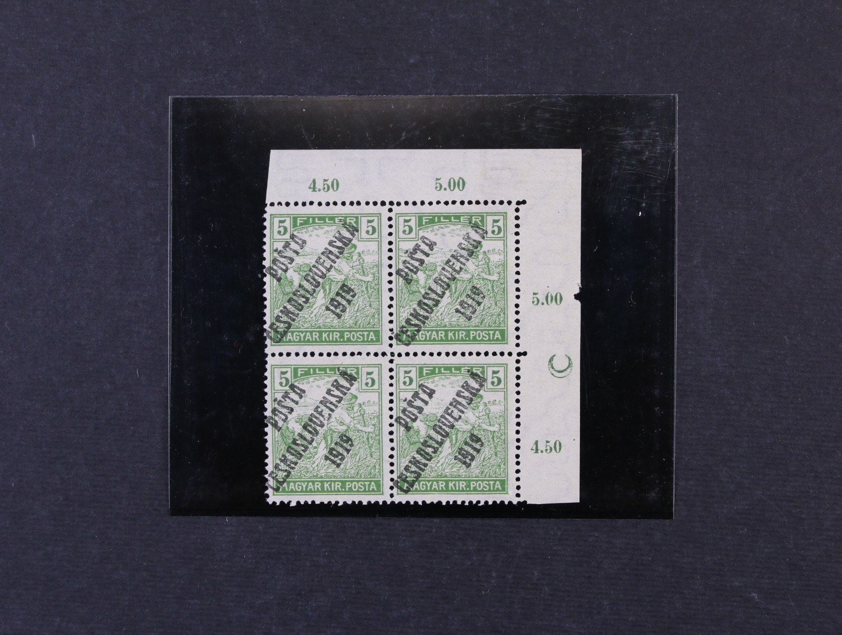 zn. č. 101 2fil Ženci ve čtyřbloku s pravým okrajem a DZ půlměsíc, navíc s výrazným stroj. obtiskem přetisku