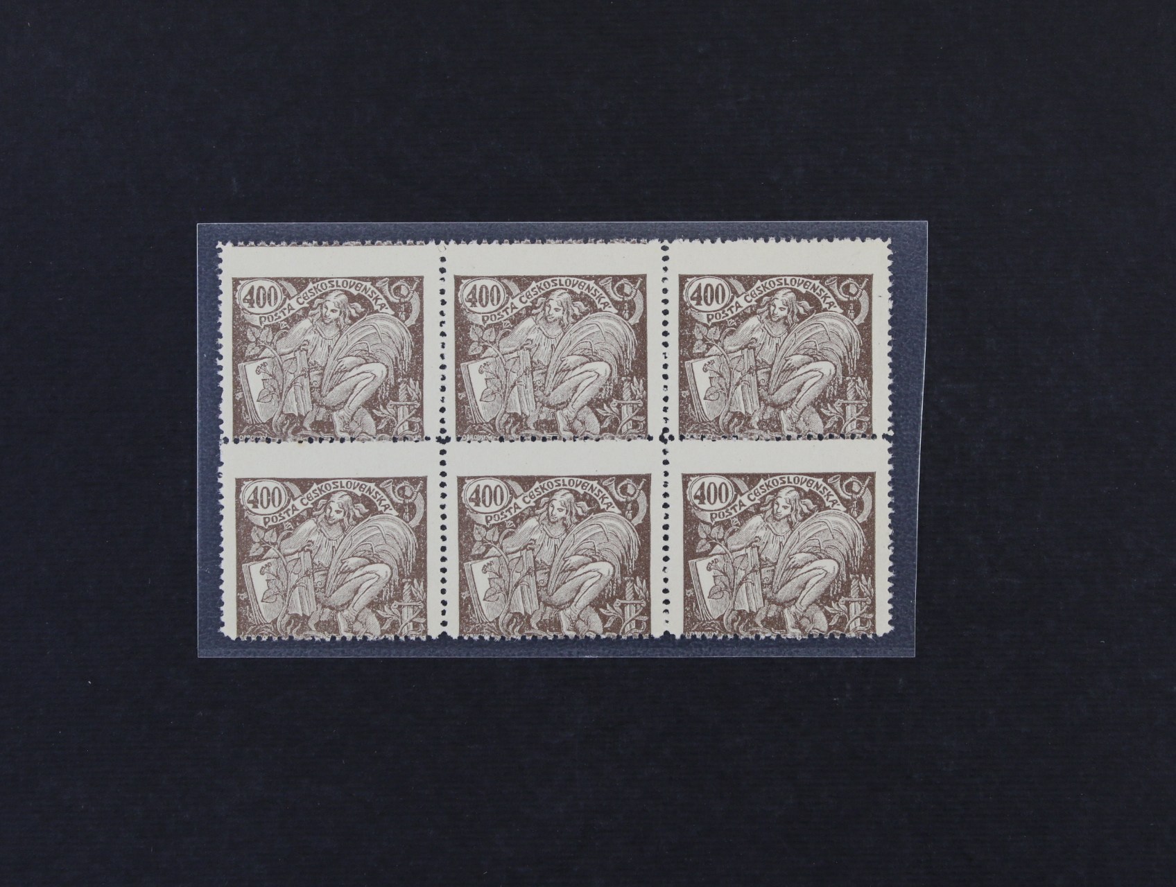 454 zn. č. 173 B, typ I - pravý horní roh. čtyřblok s DV červená čára přes meč a levé koleno 400