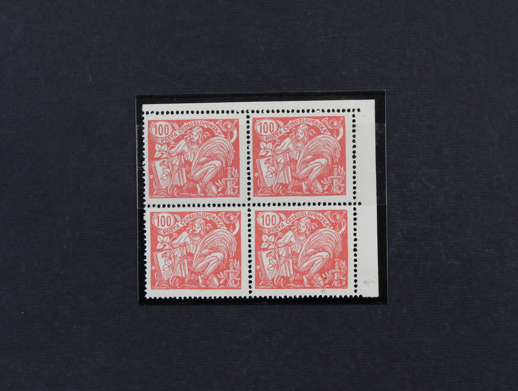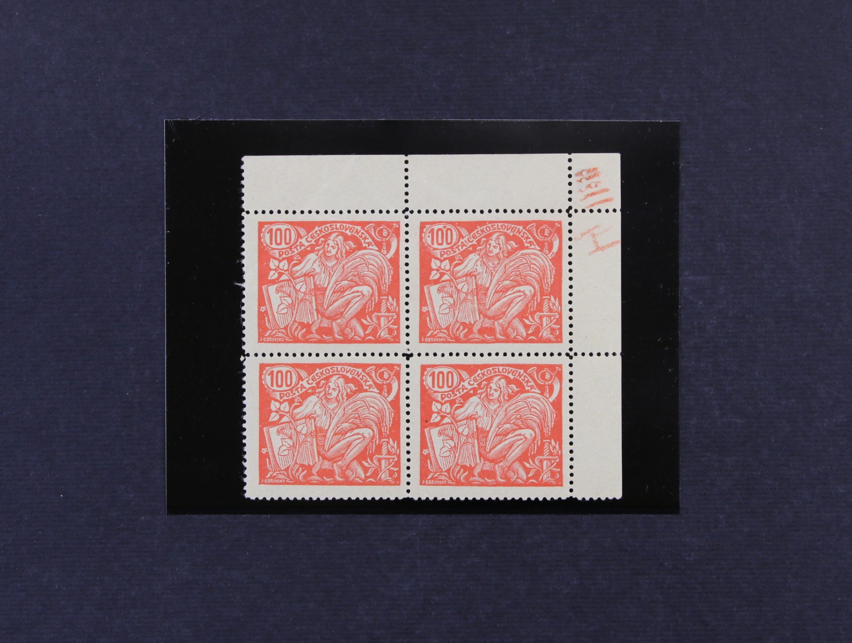 452 zn. č. 173 A, typ II - pravý horní roh. čtyřblok, DV na ZP 10 skvrny v hodnotovém štítku, červená čára a body mezi A a Č v nápisu ČESKOSLOVENSKÁ 800