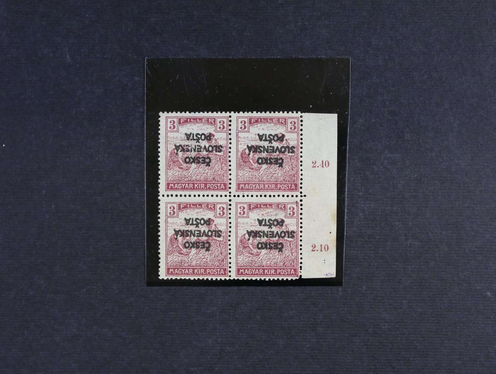 701 Žilinské vydání - zn. RV č. 138 ve čtyřbloku s pravým okrajem, převrácený přetisk, zk. Vrba, kat. cena 2200 Kč 1600