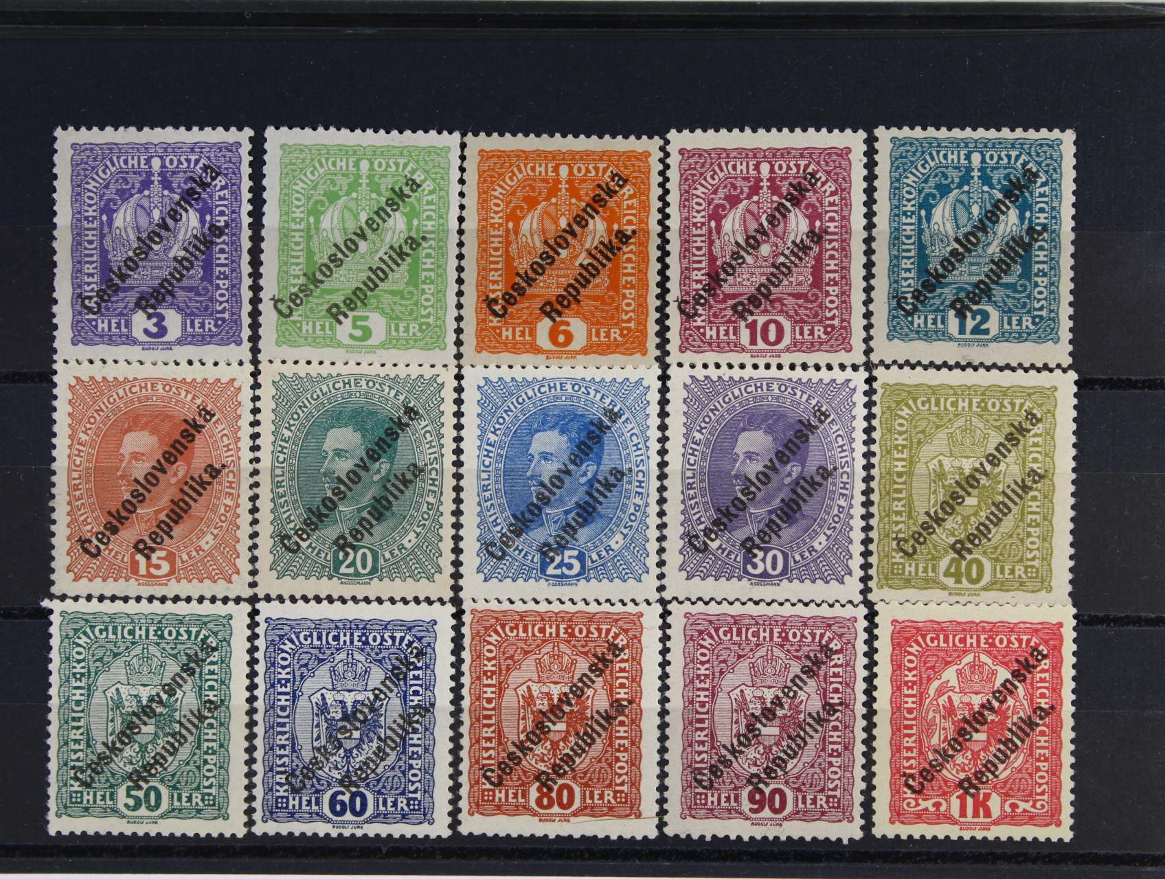 705 Lehevcův přetisk - sestava 15 ks rak. zn. Mi. č. 185 - 189, 194 - 199, 221 - 224 s přetiskem Československá Republika 1500