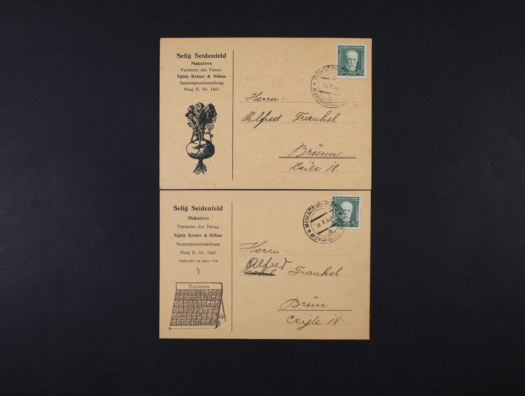 709 dva firemní KL s přítiskem do Brna s pod. raz. VLP MUKAČEVO - BAŤOV 13. resp. 16.10.34, dobrá kvalita, zajímavé 500