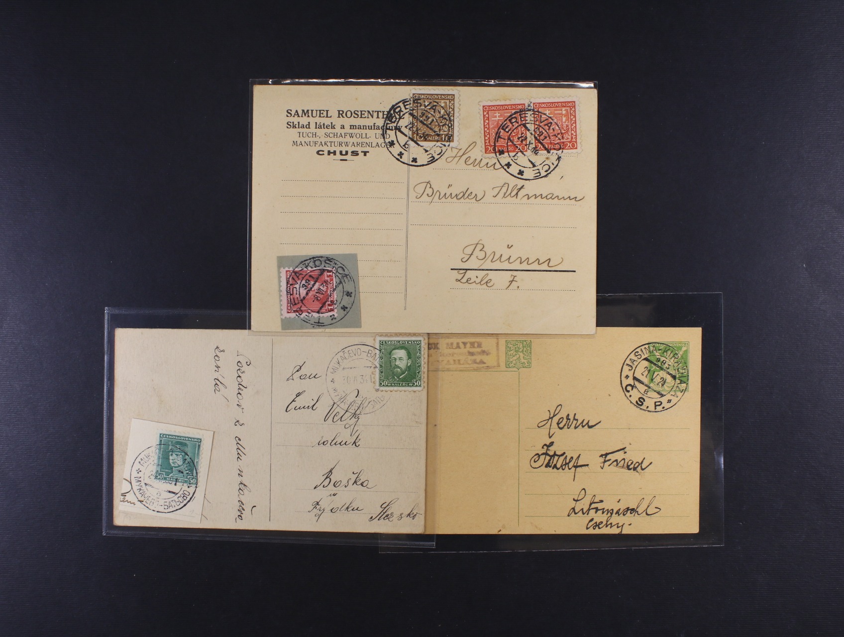 710 sestava 3 ks celistvostí do Česka z let 1924 - 34 s pod. raz. VLP TERESVA - KOŠICE, MUKAČEVO - BAŤOVO, JASINA - KIRALYHAZA, zajímavé, dobrá kvalita 500