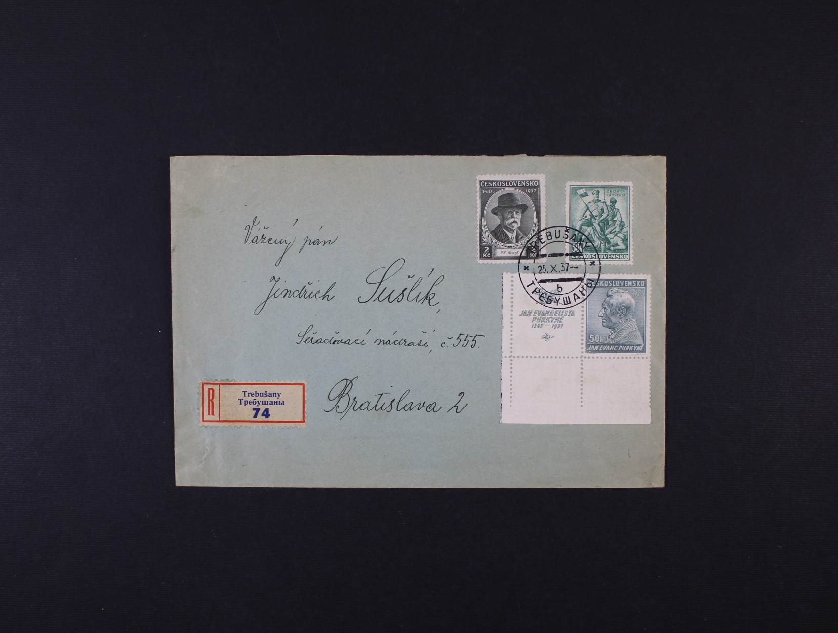 711 R-dopis do Bratislavy frank. pestrou frankaturou, pod. dvojjazyčné raz. TREBUŠANY 25.10.37, zajímavé 400