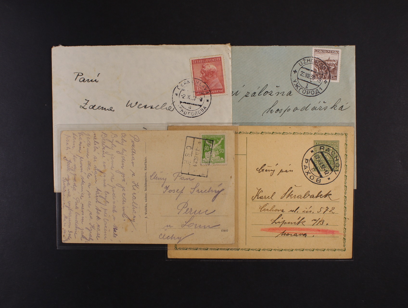 712 sestava 4 ks celistvostí do Česka z let 1924 - 38 s pod. raz. KIRALYHAZA, RACHOV, ČERNÁ HLAVA, UŽHOROD (RECO) 400