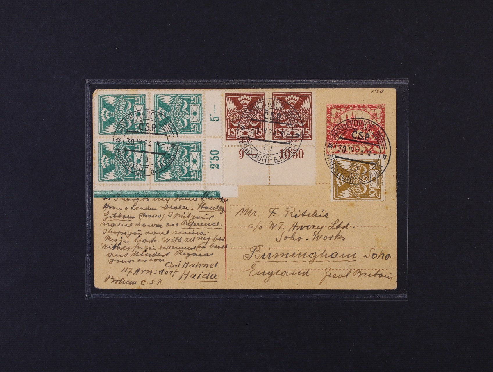 CDV č. 8 do Anglie dofrank. zn. č. 146, dvoupáskou č. 147 a rohovým čtyřblokem č. 149, pod. raz. ARNOULTOVICE 30.9.24, dekorativní
