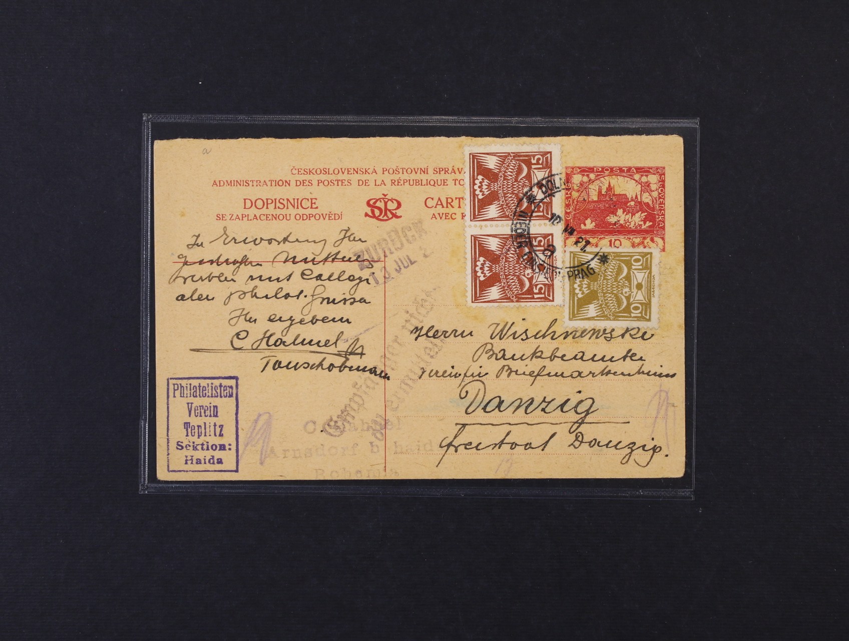 CDV č. 9, část 1 do Danzigu dofrank. zn. č. 146 a dvoupáskou zn. 147, pod. raz. VLP NIEDER EINSIEDEL - PRAG 10.7.21