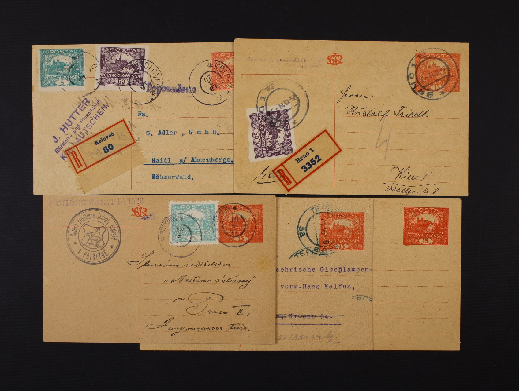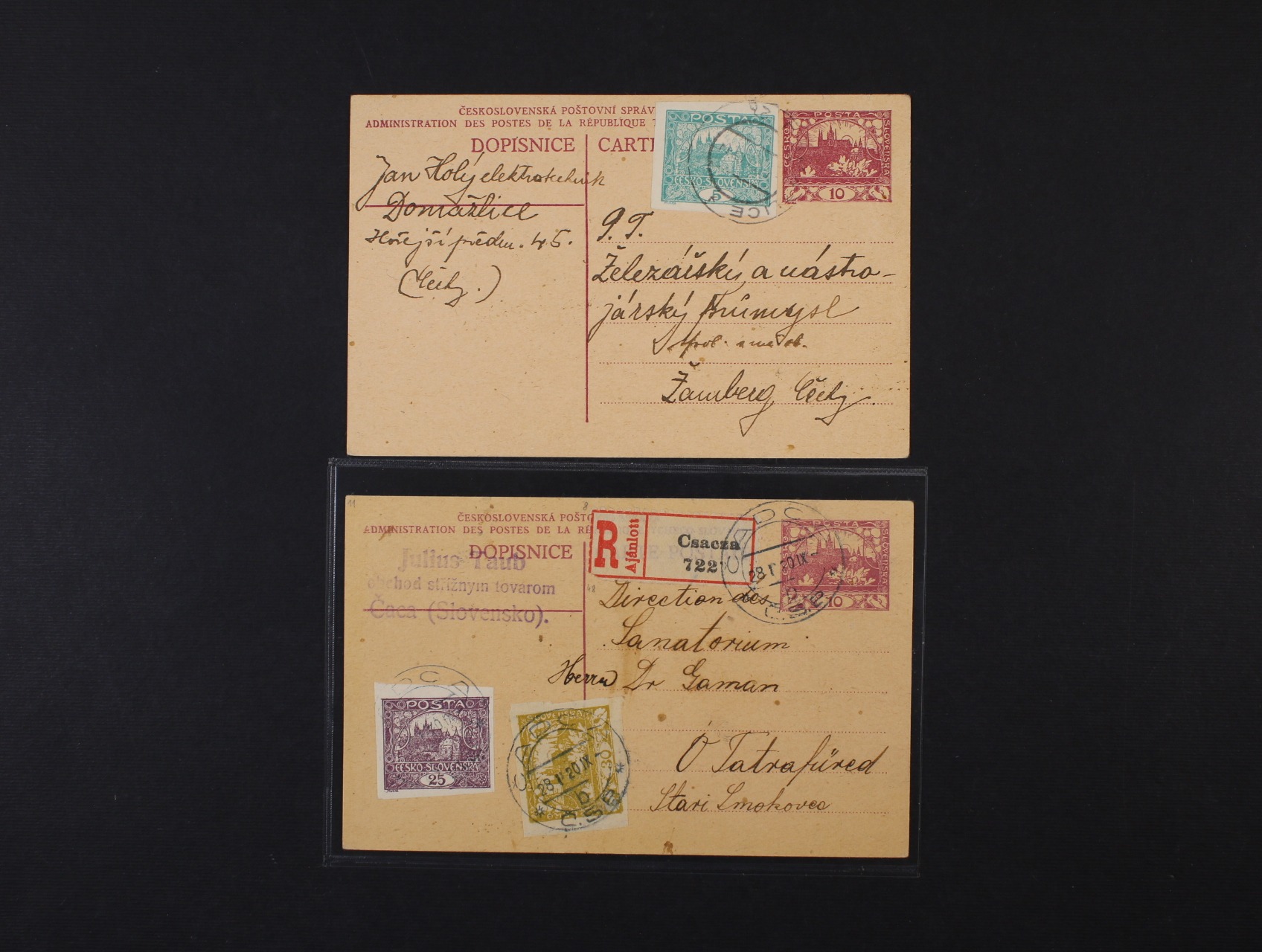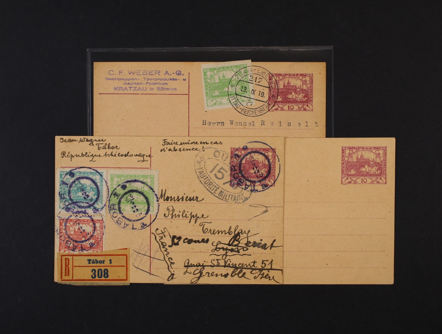 CDV č. 10 nepoužitá, dtto dofrank. zn. č. 3, pod. raz. VLP č. 17 ŽITAVA - LIBEREC 13.9.19 a dtto RECO do Švýcarska dofrank. zn. č. 3 D, 5 D, 8 D, pod. raz. TÁBOR 1 23.4.19 + oválné cenzurní raz., zajímavé