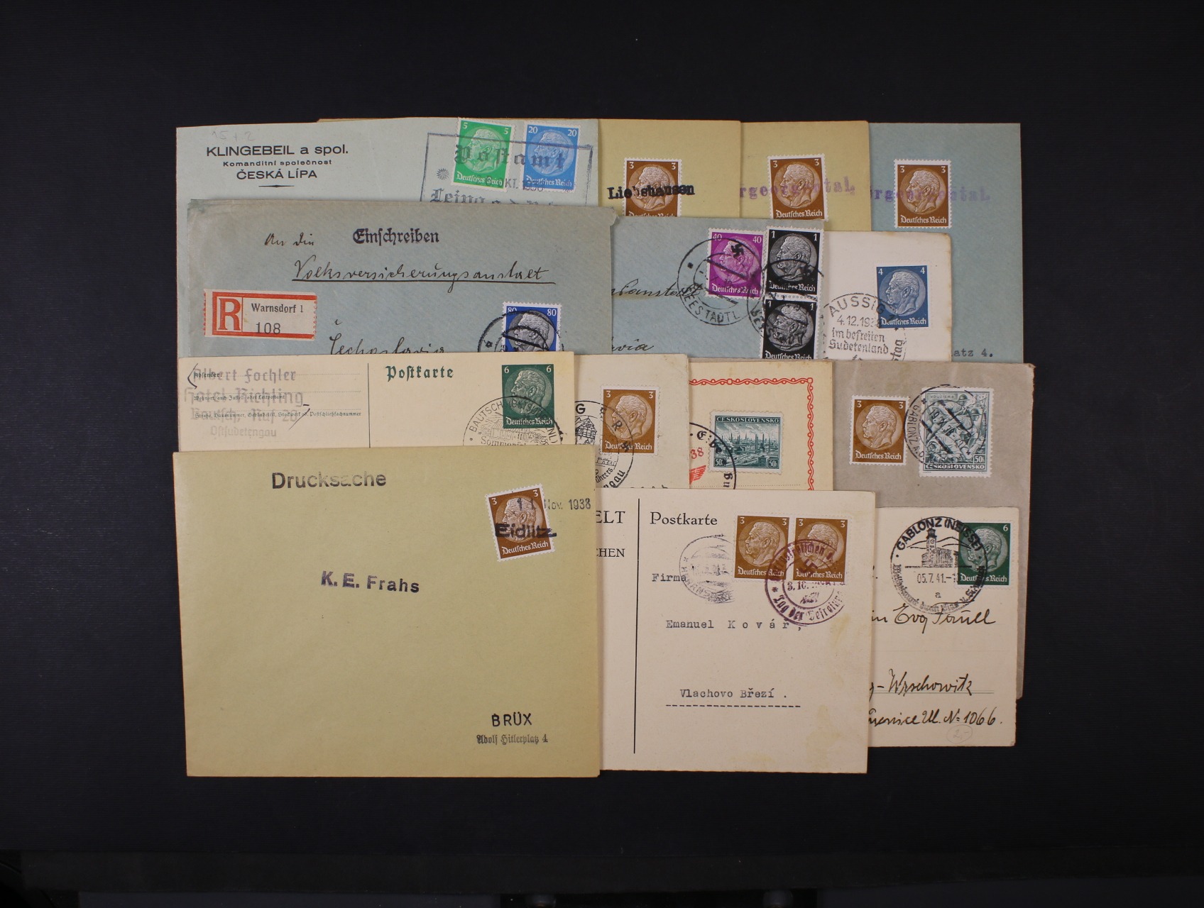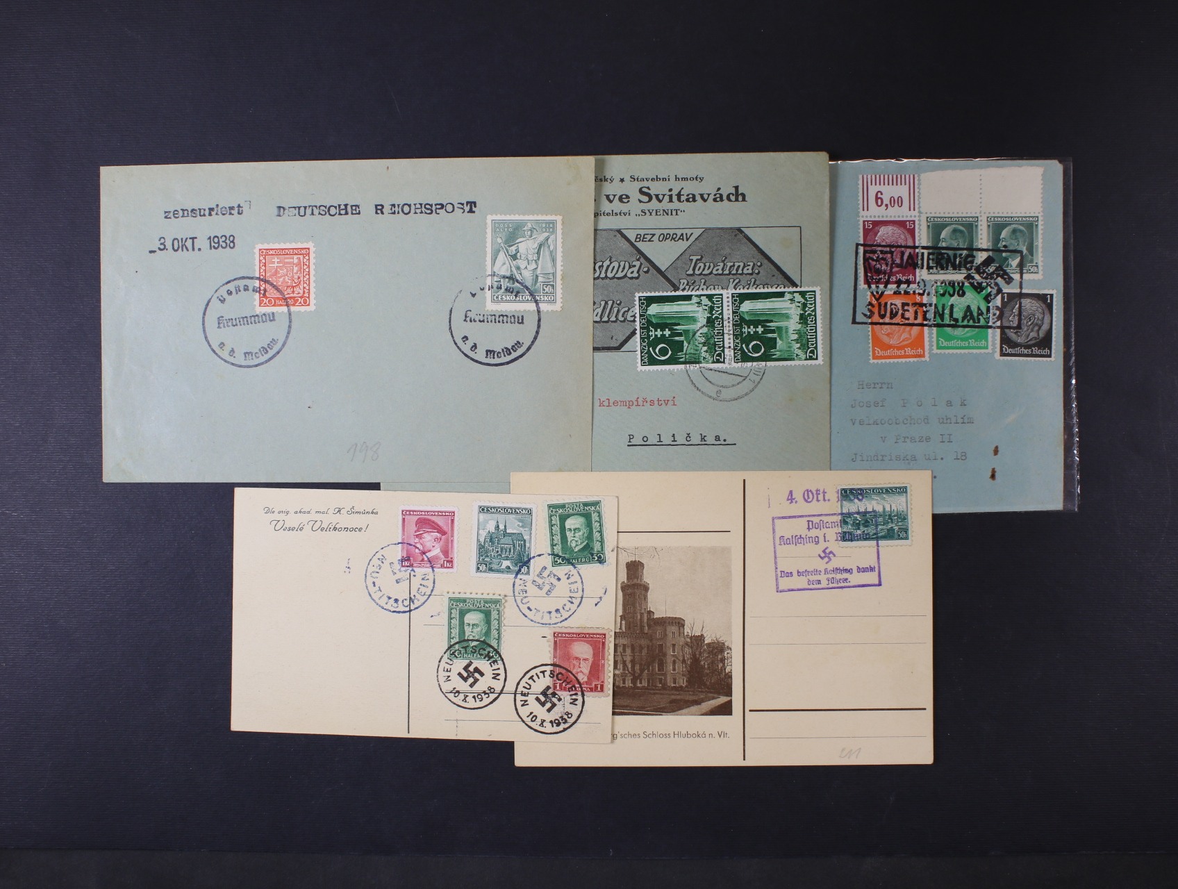 787 firemní dopis s raz. ZWITAU, dopis frank smíš. frankaturou s DR JAUERING + rámeč. raz. a obálka a dva KL s raz. NEU-TITSCHEIN 10.10.38. POSTAMT KALSSCHING i.BÖHMEN a POSTAMT KRUMMAU a.d. MOLDAU 400